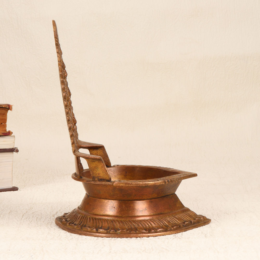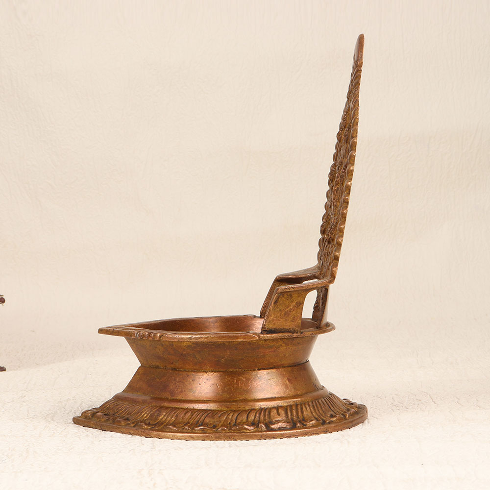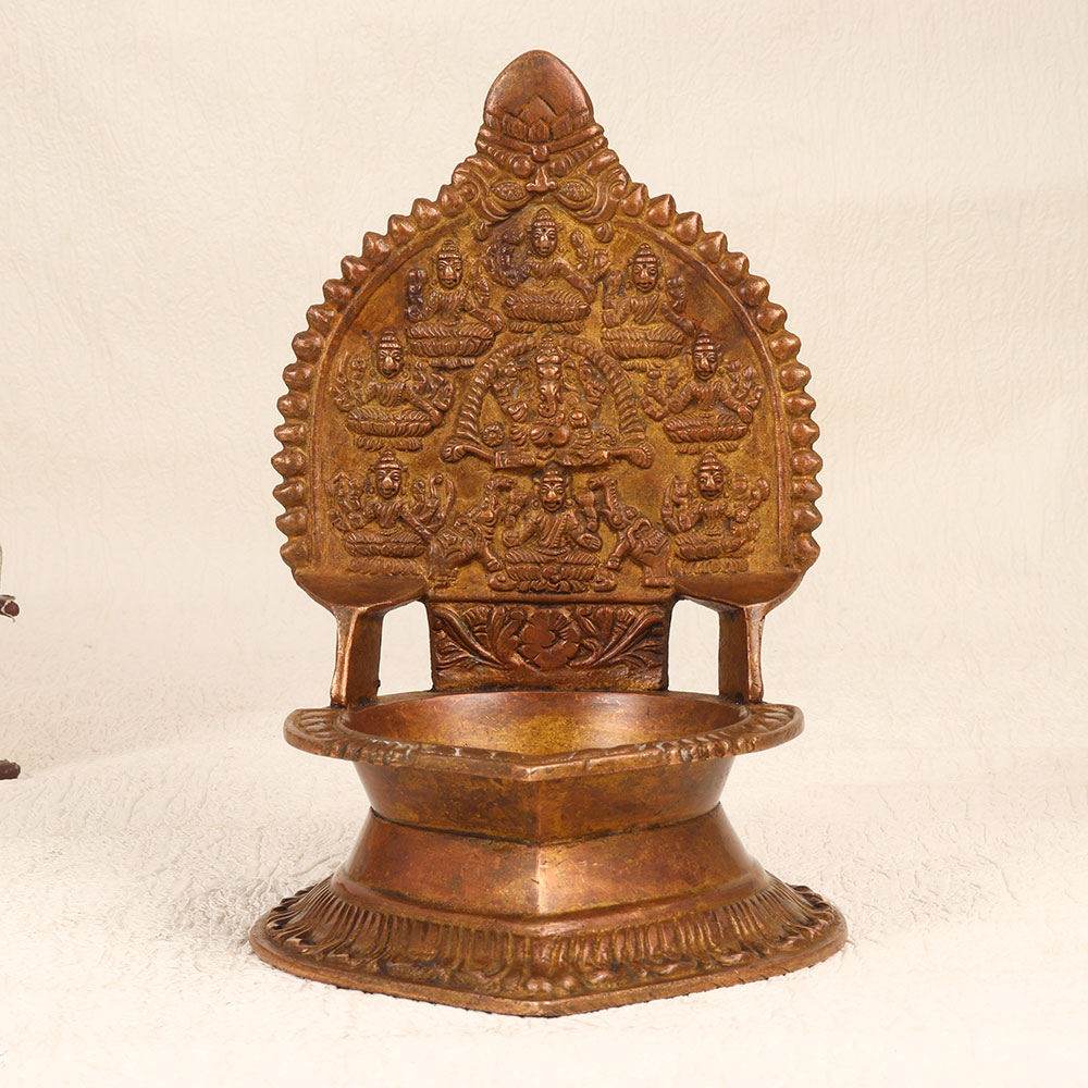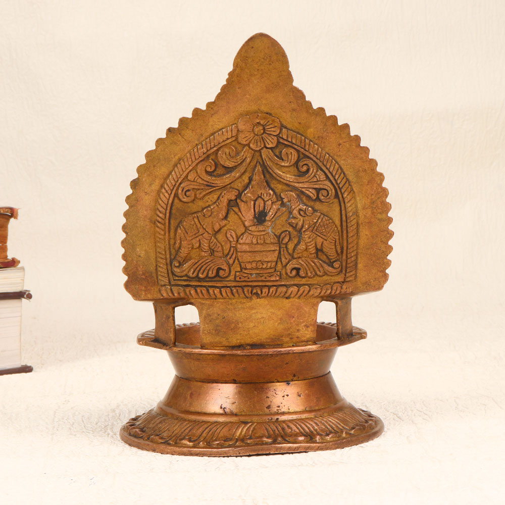 This Intricate Vintage Brass Oil Lamp Invites Goddess Lakshmi's Blessings. This ornate vintage brass lamp features the Hindu goddess Lakshmi, carved and engraved by hand in the traditional South Indian style. Lakshmi sits gracefully surrounded by intricate patterns and motifs that accentuate her divine beauty. When lit, the oil lamp emanates a natural, auspicious glow. The soft, warm light dances across the vintage brass, highlighting the masterful metalwork and engraving. Place this lamp prominently in your home to invite Lakshmi's blessings and her gifts of prosperity, wisdom, and good fortune. An illuminating statement piece, this lamp will inspire conversation and uplift any space with its divine imagery and natural light. A meaningful addition to a spiritually-minded home. Let Lakshmi's glow fill your home with peace, harmony, and divine connection.