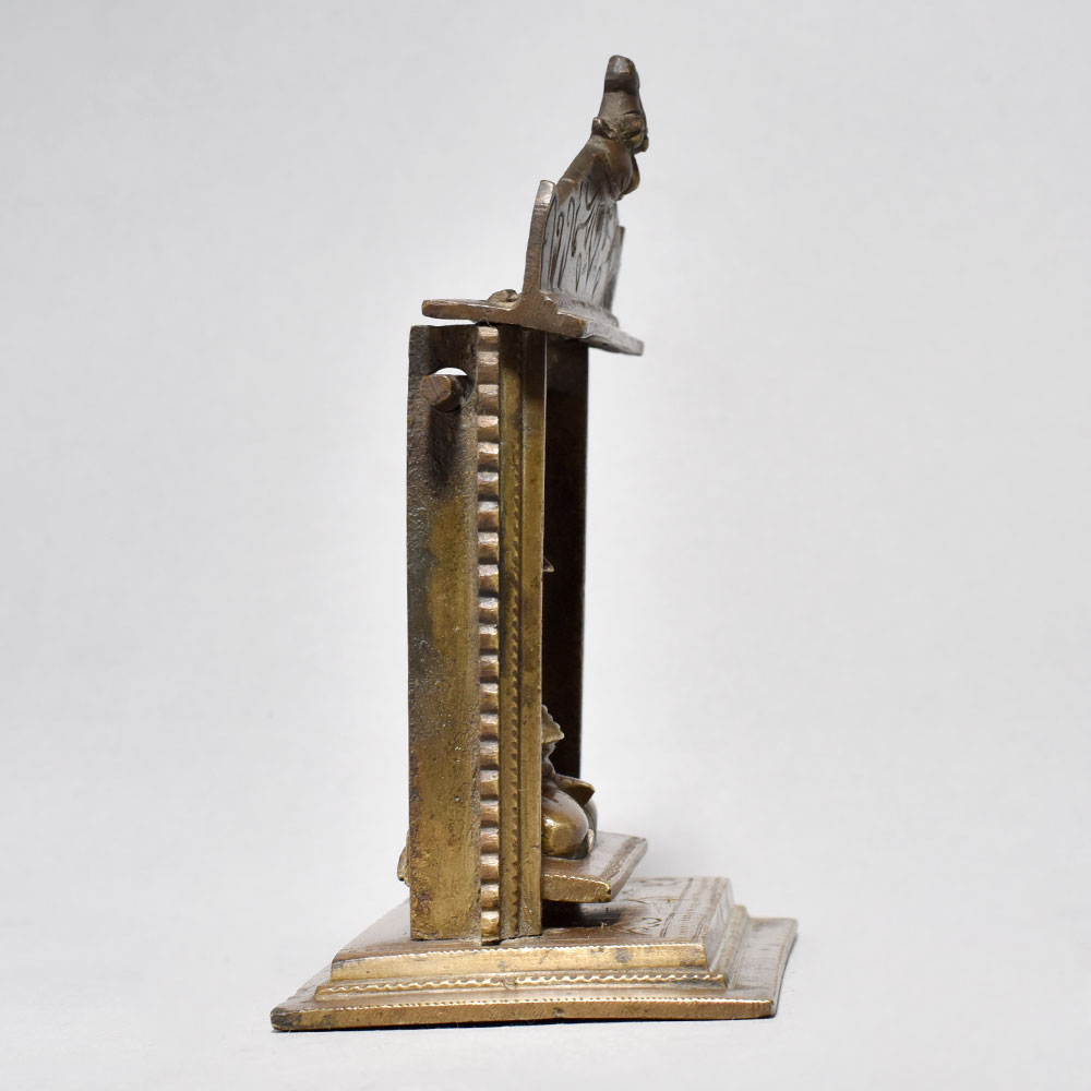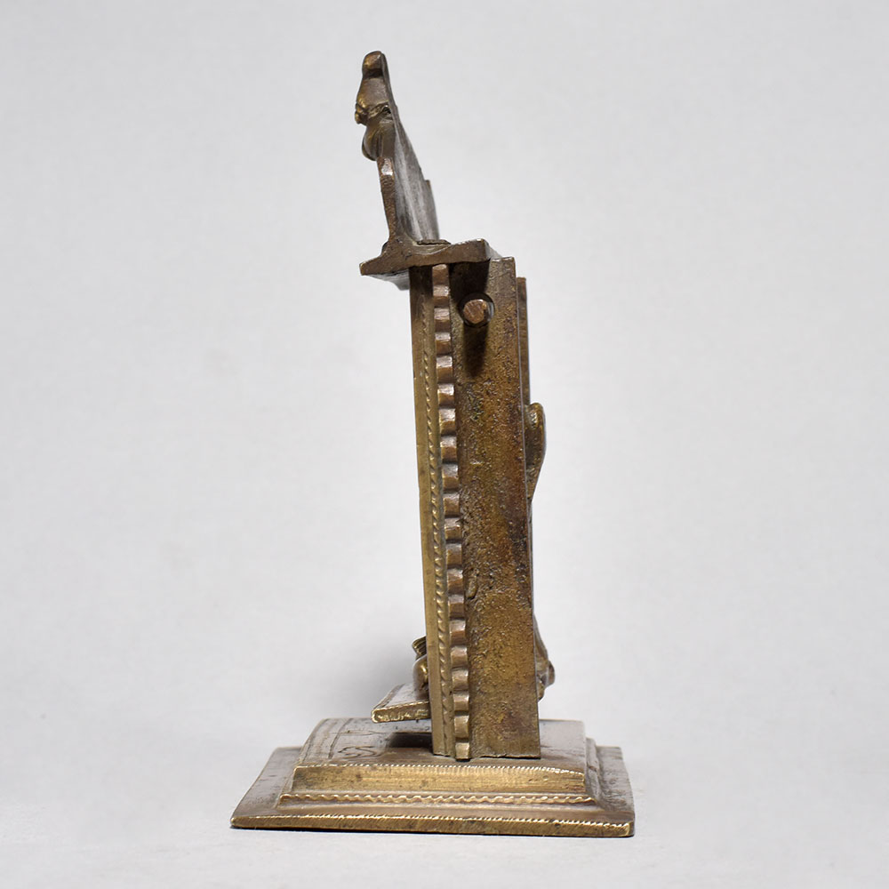 Elevate your spiritual dcor with this exquisitely handcraftedBrass Goddess Padmavati on Swing Statue, a timeless representation of divinity, devotion, and traditional Indian artistry. Cast in solid brass, this unique sculpture features Goddess Padmavati seated gracefully on a swing inside a beautifully carved temple-like frame, symbolizing serenity, protection, and auspicious energy. Every detail - from the intricate facial features to the ornate arch and decorative Yali motifs on the topreflects the skill of master artisans who follow age-old metalworking traditions. The antique brass finish enhances its sacred aura, making it a perfect addition to your home temple, meditation room, study table, or spiritual dcor corner. This Padmavati swing idol is ideal for daily puja rituals, festive worship, gifting, or for collectors who appreciate classical Indian craftsmanship. Its compact, temple-inspired structure gives it a striking presence while remaining easy to place on altars, shelves, or consoles. Handmade with devotion, this statue radiates calmness and positivity, making it a meaningful piece for enhancing spiritual ambiance and cultural elegance in any space.