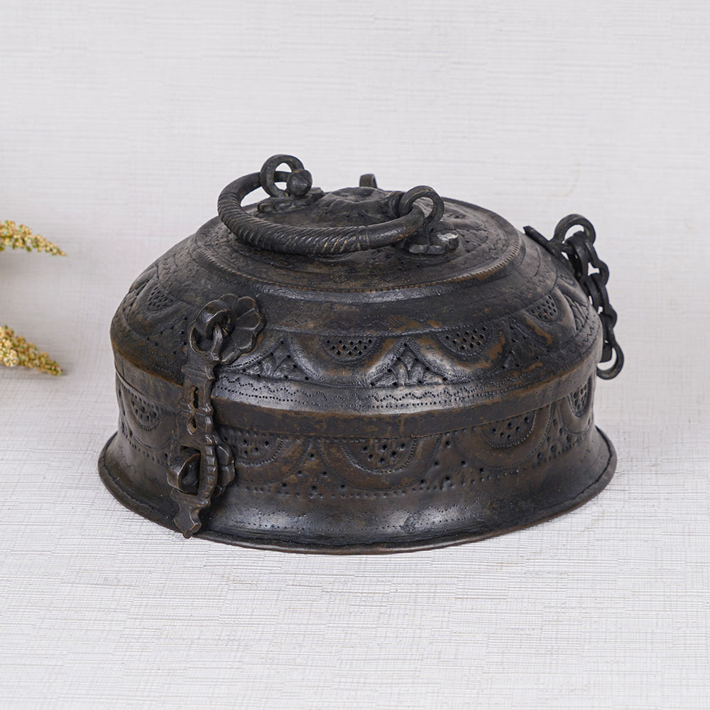Buy a handmade Jewelry Box online and get a hassle free delivery at your doorstep. This designer jewelry box features a stunning black finish, imparting a timeless vintage look that adds an aura of elegance to any setting. The surface is adorned with beautifully engraved patterns, showcasing the craftsmanship and attention to detail. Equipped with a convenient handle on the top for easy portability and a secure latch to keep your precious items safe, it was originally intended for storing jewelry at home. However, its versatile nature allows it to be utilized as a small jewelry gift box or a luxurious storage solution for cherished belongings. Beyond practicality, this ornate piece can serve as a captivating decor element, enhancing the ambiance of your home, office, restaurant, or hotel. Its alluring charm also makes it an ideal exhibit in museums or exhibitions, capturing the attention of admirers. Gift this exquisite brass jewelry box to your loved ones on special or festive occasions, and witness their delight as they unwrap a treasure that radiates both beauty and craftsmanship.