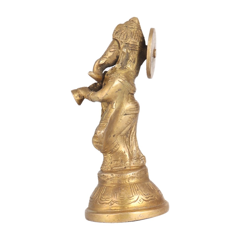 Buy a brass statue of Lord Ganesha that is a beautiful representation of the revered Hindu God, known for his wisdom, intellect, and love for music. In this statue, Lord Ganesha is depicted playing the trumpet, an instrument widely used in Indian classical music. The statue's golden finish enhances its beauty and radiates a sense of positivity and warmth. It is perfect for placing in prayer rooms at home, office, restaurant, hotel, or gym, creating a serene and calming environment. Lord Ganesha is believed to be the remover of obstacles and the lord of new beginnings, and is worshipped by millions of Hindus worldwide. The statue's intricate details and expert craftsmanship make it an exquisite and valuable piece of art, inspiring all who see it. You can gift this auspicious item to your loved ones on special or festive occasions.