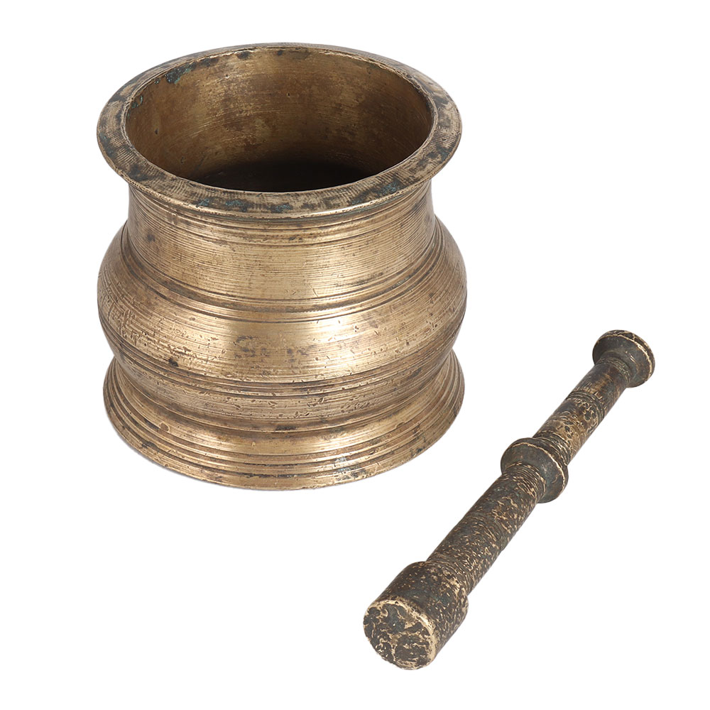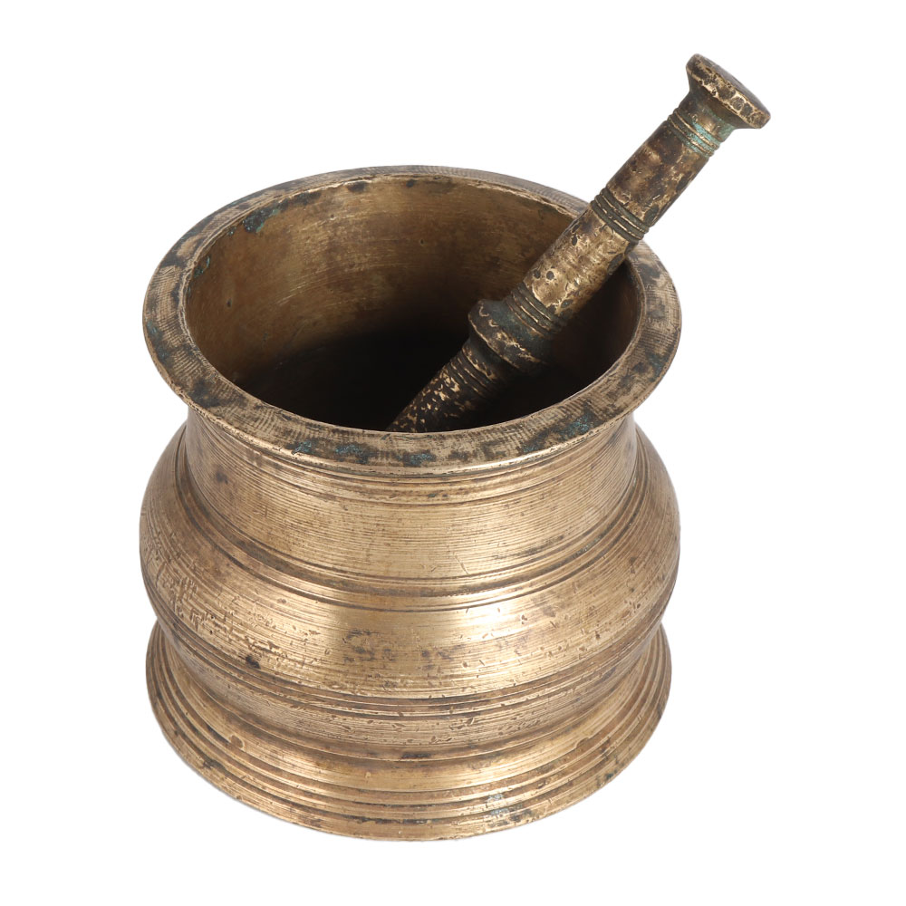 Buy a handmade brass mortar and pestle online from our website and get hassle-free delivery right to your doorstep. Its high quality brass leaves a remarkable impression to the decoration. It is handmade by skilled Indian craftsmen using ancient methods. Mortar and pestle is a traditional Indian grinder used for grinding spices, medicines and Ayurvedic medicines. Since it is made of high quality brass and brass spreads positive energy, it is beneficial for health to use it for grinding spices. However, since it is a used item, we recommend using this pestle and mortar for decoration. Nowadays it is in great demand for decorating homes, offices, hotels, restaurants and cafes. A perfect gift for any special and festive occasion for your loved ones.