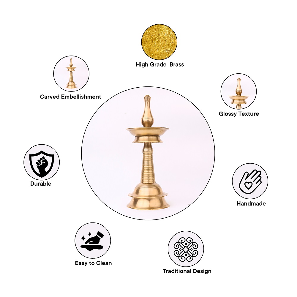 Discover the beauty of South Indian craftsmanship with this exquisite handmade brass oil lamp. Skilled artisans have poured their heart and soul into creating this piece, resulting in a shiny finish that reflects their dedication and expertise. This lamp is specially designed for use in temples during pooja and rituals, as well as for special occasions and celebrations. Its vintage charm and unique design make it a perfect decorative piece that adds a touch of elegance to any space. Whether used as a focal point in your pooja room, a conversation starter in your home, or a thoughtful gift for loved ones, this brass oil lamp is a treasure that embodies the richness of Indian cultural traditions and the art of handmade craftsmanship.