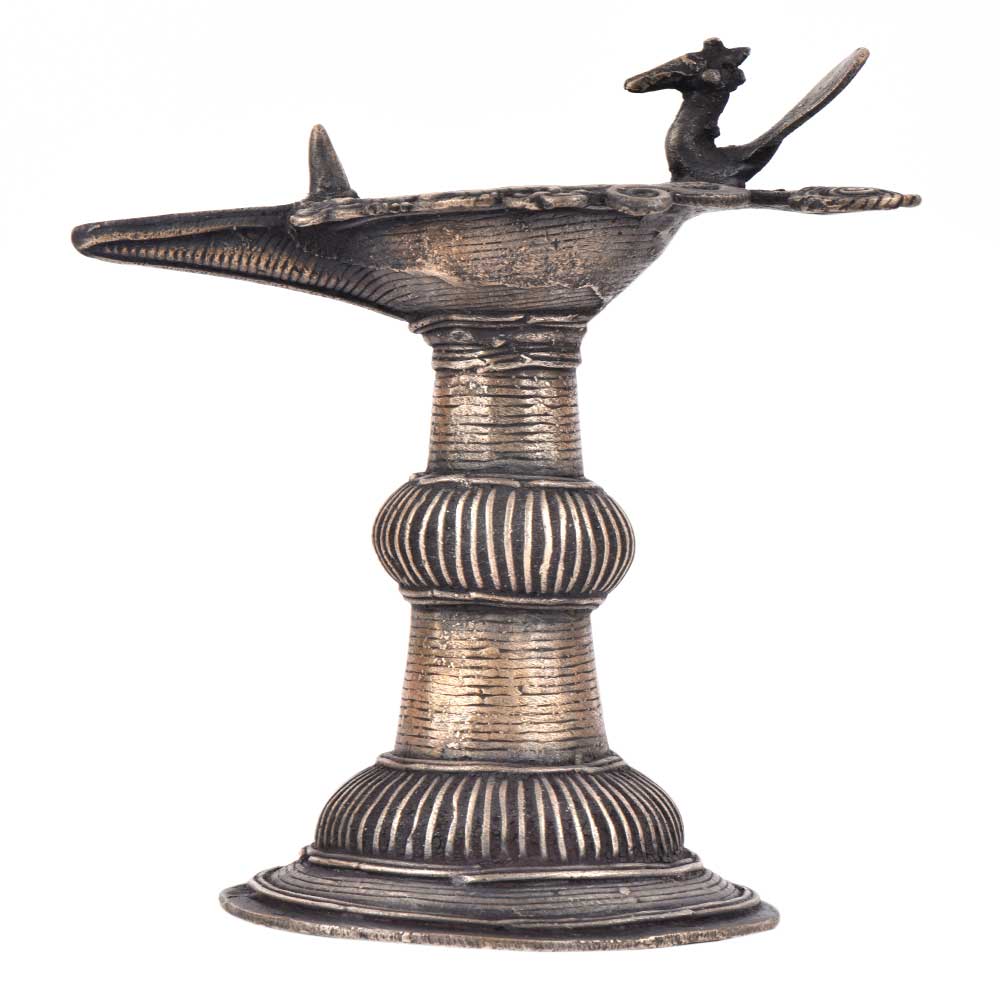 Handcrafted using old lost wax technique primarily practiced in Orrisa and West Bengals by the local or tribal artisans. In this technique the molten wax is poured into desired clay mould and when the wax melts the clay is broken and we get the desired metal object which is further polished to perfection. The Deep Cup Can Be Filled with Oil and Light a Cotton Wick. Diyas/ Oil Lamps are Considered Auspicious as in Hindu Religion. It is detailed with Elephant and Peacock Animals with Beautiful Details.