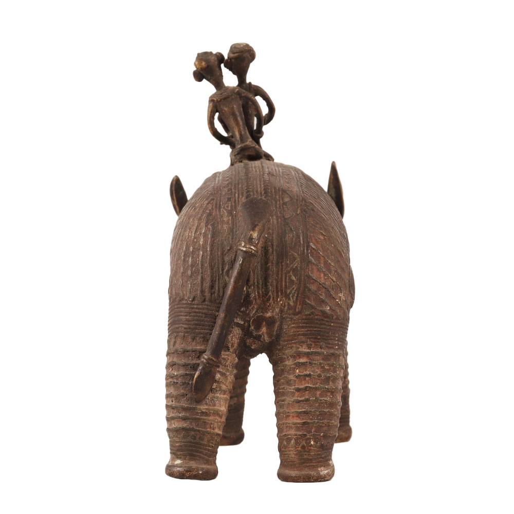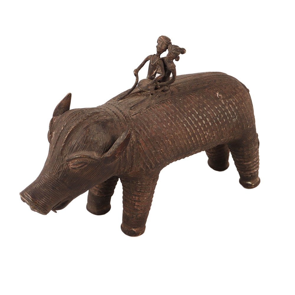 This brass statue of a pig with two riders in tribal art is a stunning work of art made by skilled Indian artisans from Nagaland. The intricate details and stunning craftsmanship that went into creating this piece are truly impressive. The tribal art style of the statue gives it a unique and distinctive look that is sure to impress any collector of decorative items. The pig with two riders adds a touch of whimsy to the piece, making it a great addition to any space. Its timeless beauty and unique style make it a must-have for any lover of tribal art, and it would make a great addition to any collection or exhibition. A perfect gift to your family, friends or relatives on special or festive occasions.