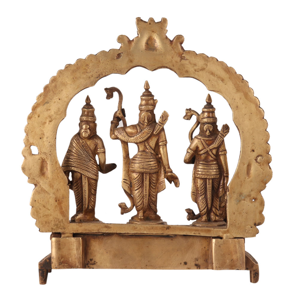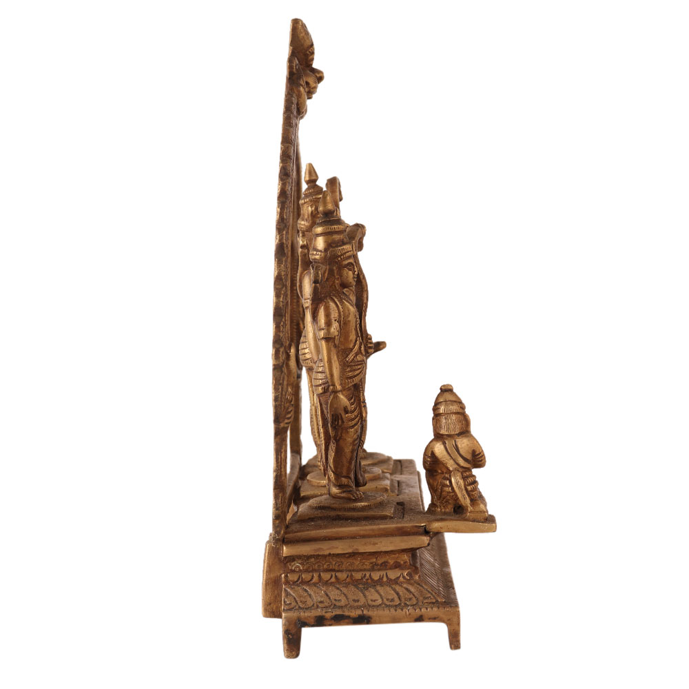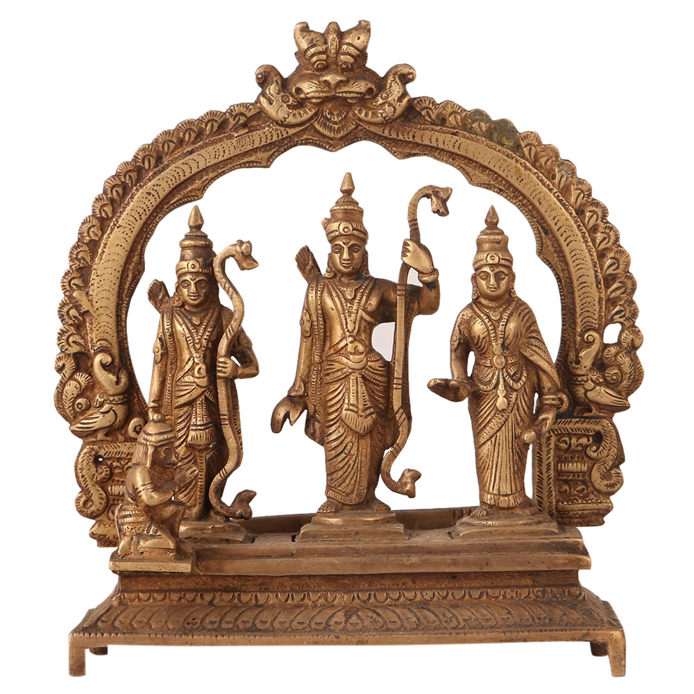 A heavy brass Ram Darbar with Hanuman greeting Lord Ram on his knees. It is hand carved by skilled Indian workers with intricate details. It has a stand with four supports to hold on the surface. In this statue, Lord Ram and Lord Laxman hold a bow in their left hand and arrows on their right shoulder. Lord Ram stands in the centre and Lord Laxman stands to the right of Ram. Goddess Sita is standing to the left of Lord Ram holding a lotus in her left hand. Hanuman is seen sitting on his knees and greeting Lord Ram. Hanuman is an ardent devotee of Lord Ram. An ideal gift on the occasion of Deepavali, New Year, wedding or birthday.