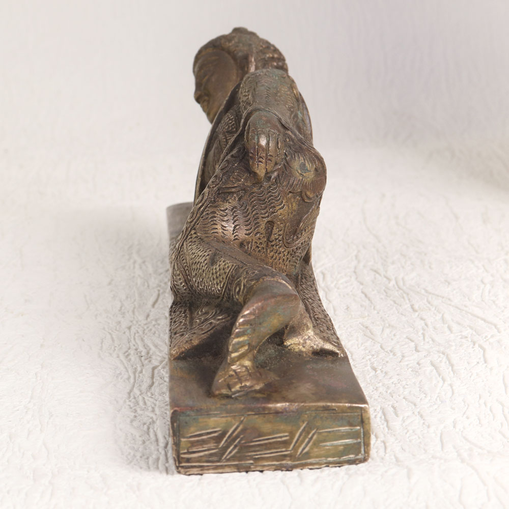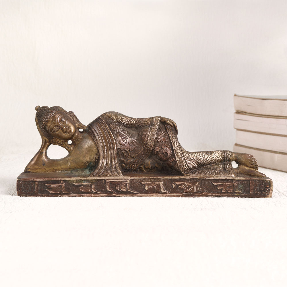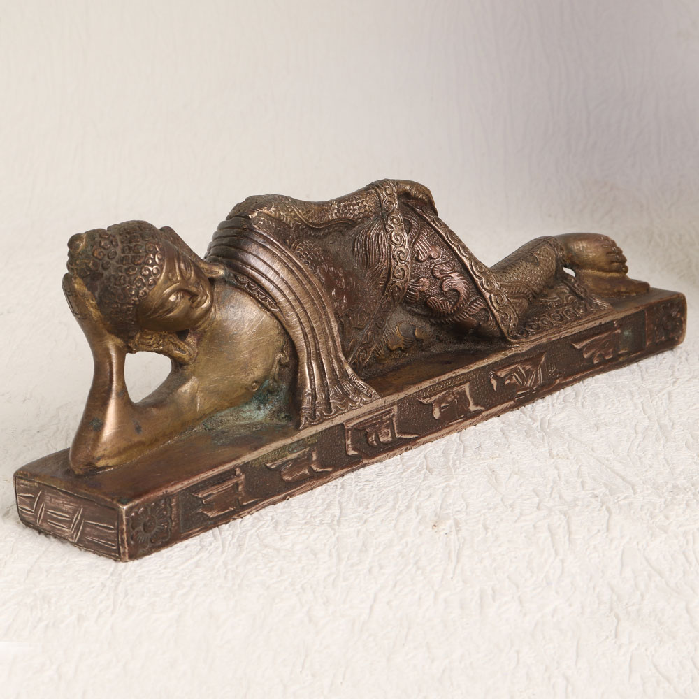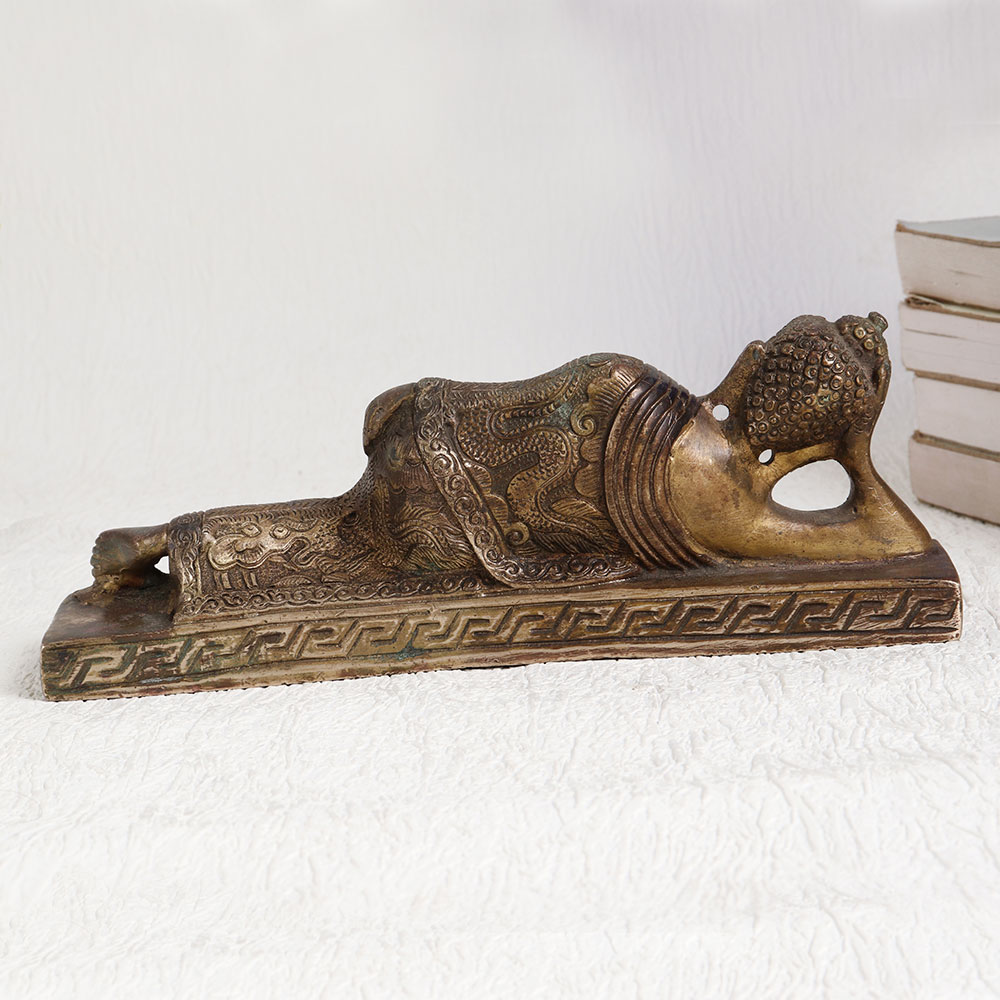 Enhance your space with the serene presence of our exquisite brass statue of Buddha in a peaceful slumber. This stunning piece of art is handcrafted by professional Chinese artisans which boasts a rich antique brown finish that adds warmth and character to any setting. Crafted with meticulous attention to detail, it captures the essence of tranquillity and spiritual serenity. Made from high-quality brass, this Buddha statue exudes a timeless elegance that suits various decor styles. Its versatility makes it a perfect addition to your home, office, restaurant, hotel, cafe, or shop, enhancing the ambiance and radiating a sense of calm. Whether you're an avid collector of vintage treasures or planning to showcase it at an exhibition, this statue is a captivating conversation starter. It embodies the craftsmanship of a bygone era while remaining relevant in contemporary settings. Celebrate special, festive, or auspicious occasions by gifting this remarkable Buddha statue to your family, friends or relatives. Its profound symbolism and timeless beauty make it a meaningful gesture that will be cherished for years to come. Bring a touch of spirituality and artistry into your life with this exceptional work of art.