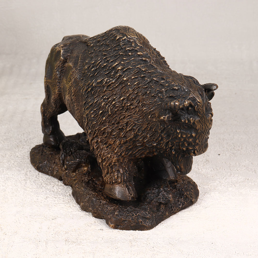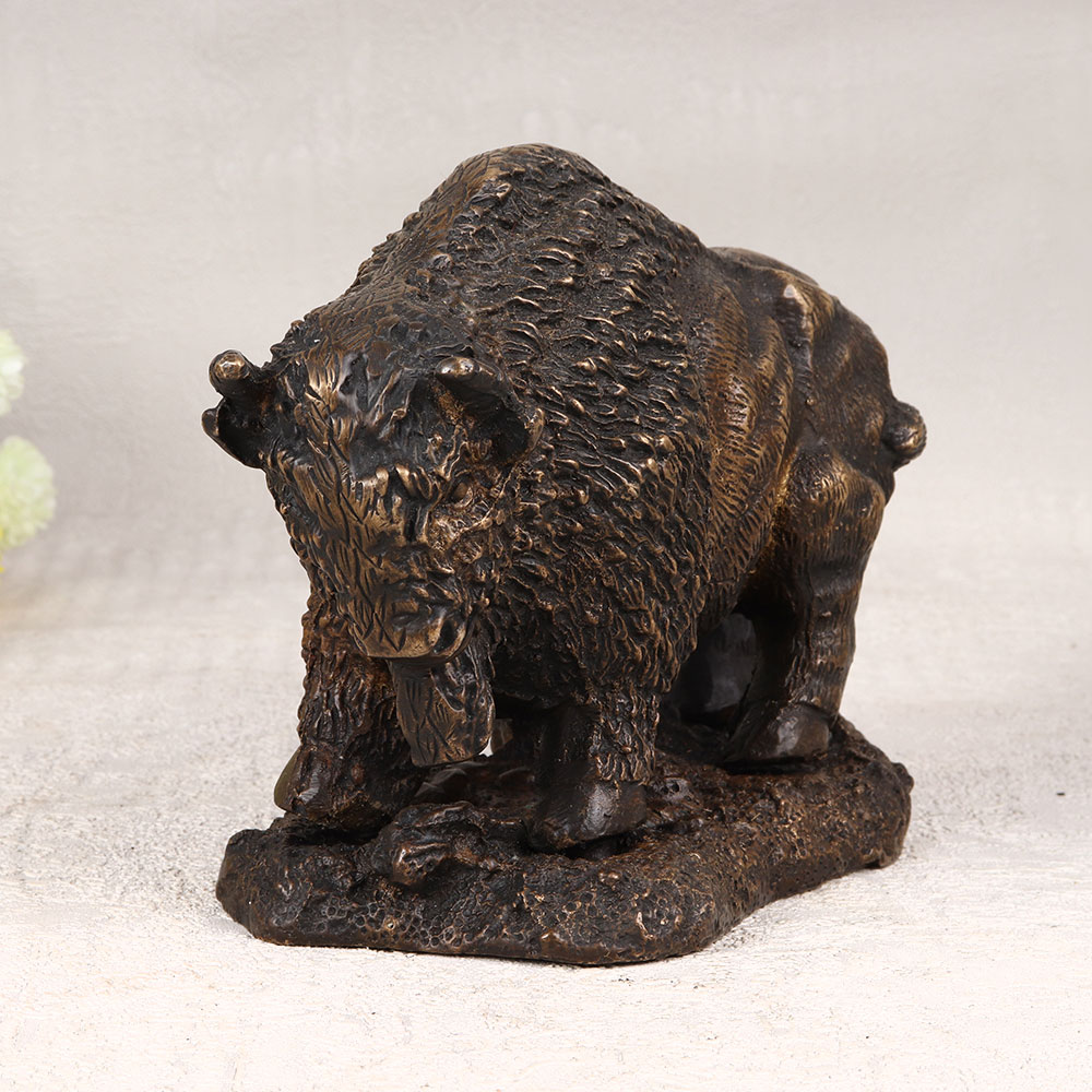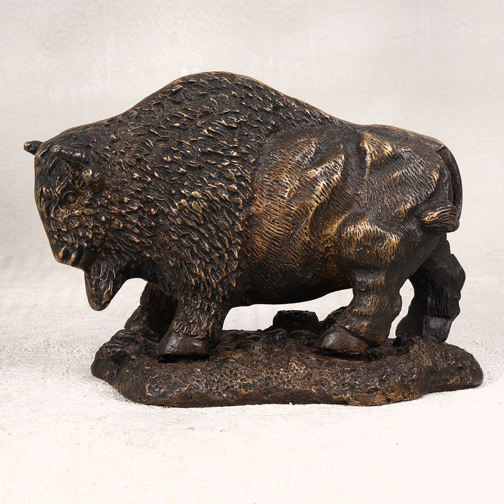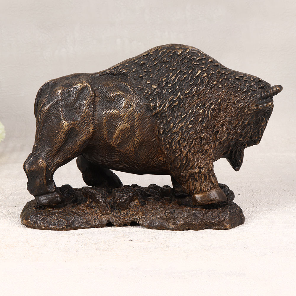 A Brass Statue of the North American Bison Buffalo which is a symbol of strength and resilience. Standing proudly on a sturdy platform, this exquisite piece showcases intricate details, expertly crafted by highly skilled artisans in the English Art tradition. The antique brown finish adds a touch of vintage charm, enhancing the allure of this handcrafted sculpture. Meticulously cast from high-quality brass, the Bison Buffalo statue is a testament to craftsmanship and precision. Suitable for a variety of spaces, including homes, offices, restaurants, hotels, or cafes, it serves as a captivating decorative accent. Elevate your surroundings with a touch of rustic elegance, making a statement that resonates with the spirit of the wild. This timeless piece isn't just a decorative item, it's an addition to a vintage collection, a unique expression of artistry. Perfect for gifting on special, festive, or auspicious occasions, this brass masterpiece is a heartfelt way to convey admiration and appreciation to your family, friends or relatives. Embrace the spirit of the wild with this remarkable Bison Buffalo statue, a cherished blend of art and nature.