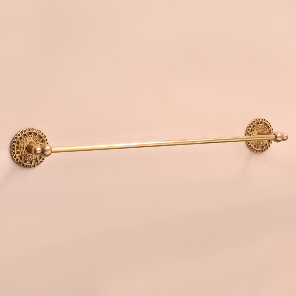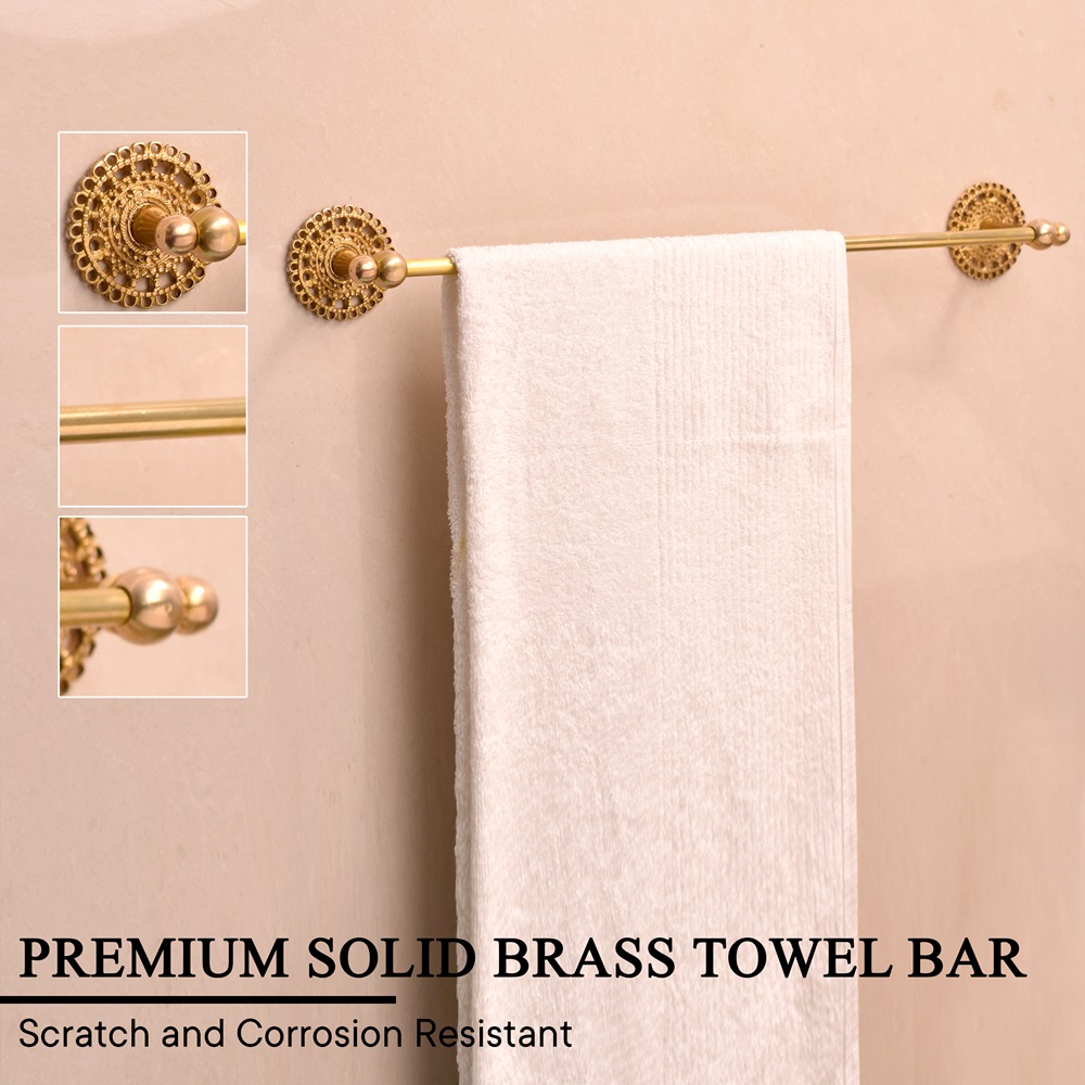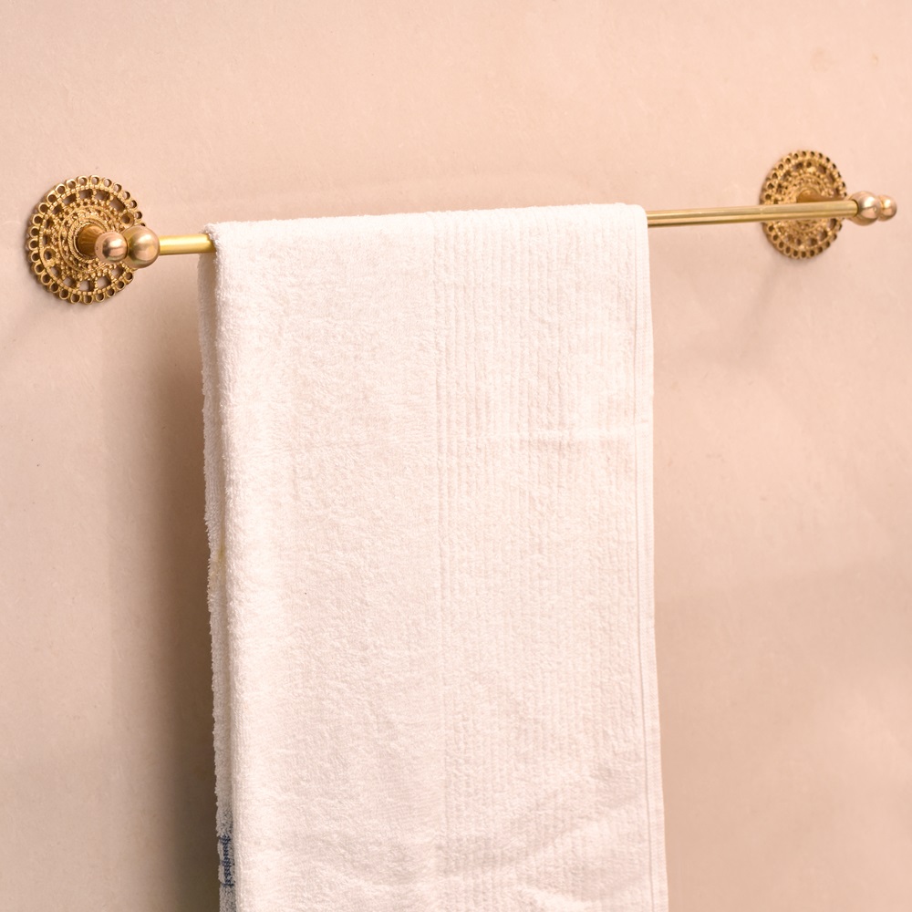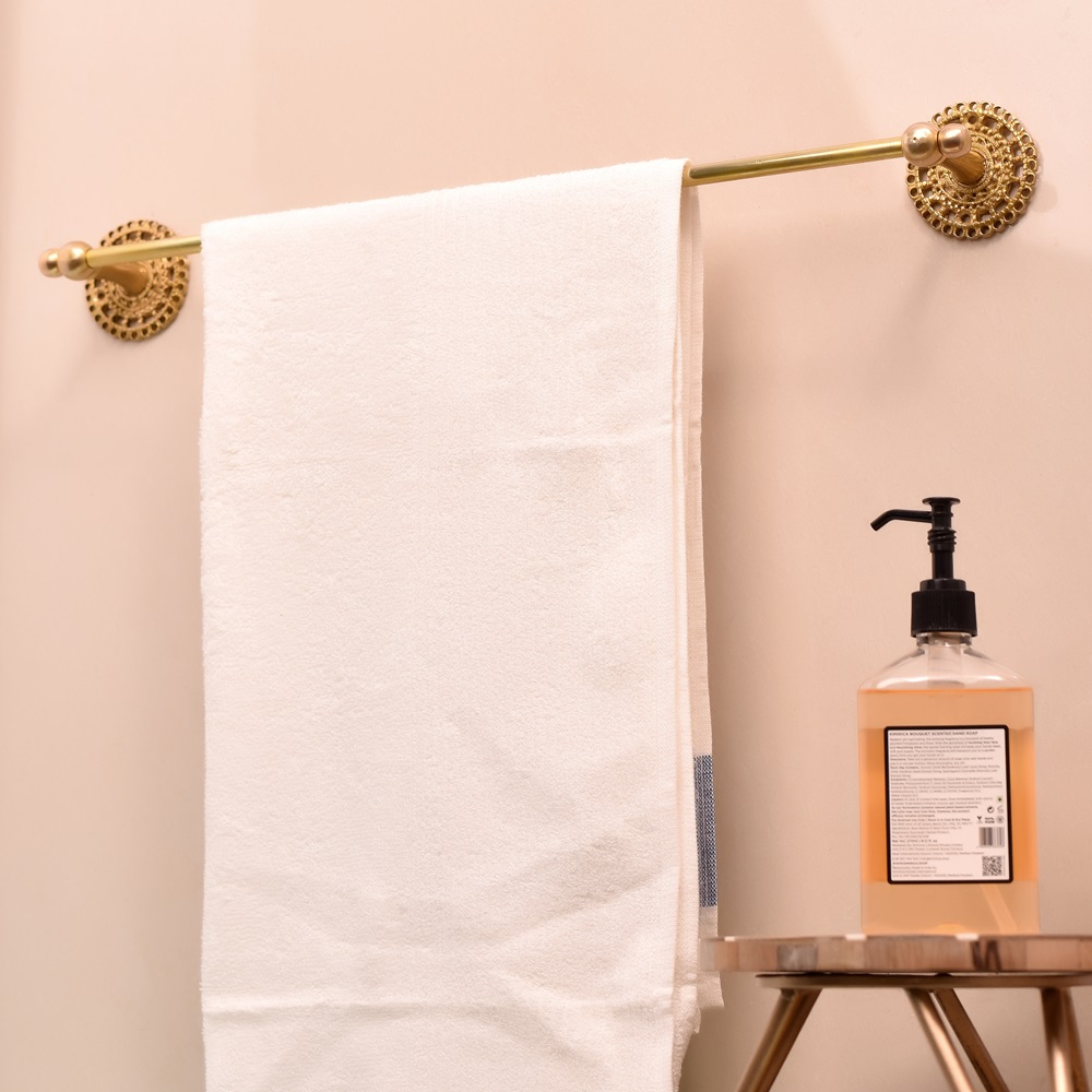 Elevate the style and functionality of your bathroom with this Handmade Brass Towel Hanger in Golden Finish. Crafted with attention to detail, this towel hanger exudes timeless beauty and sophistication. The luxurious golden finish not only enhances the aesthetic appeal of your bathroom but also offers lasting durability, making it the perfect blend of style and practicality.