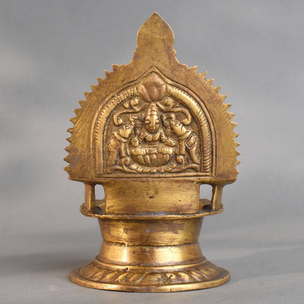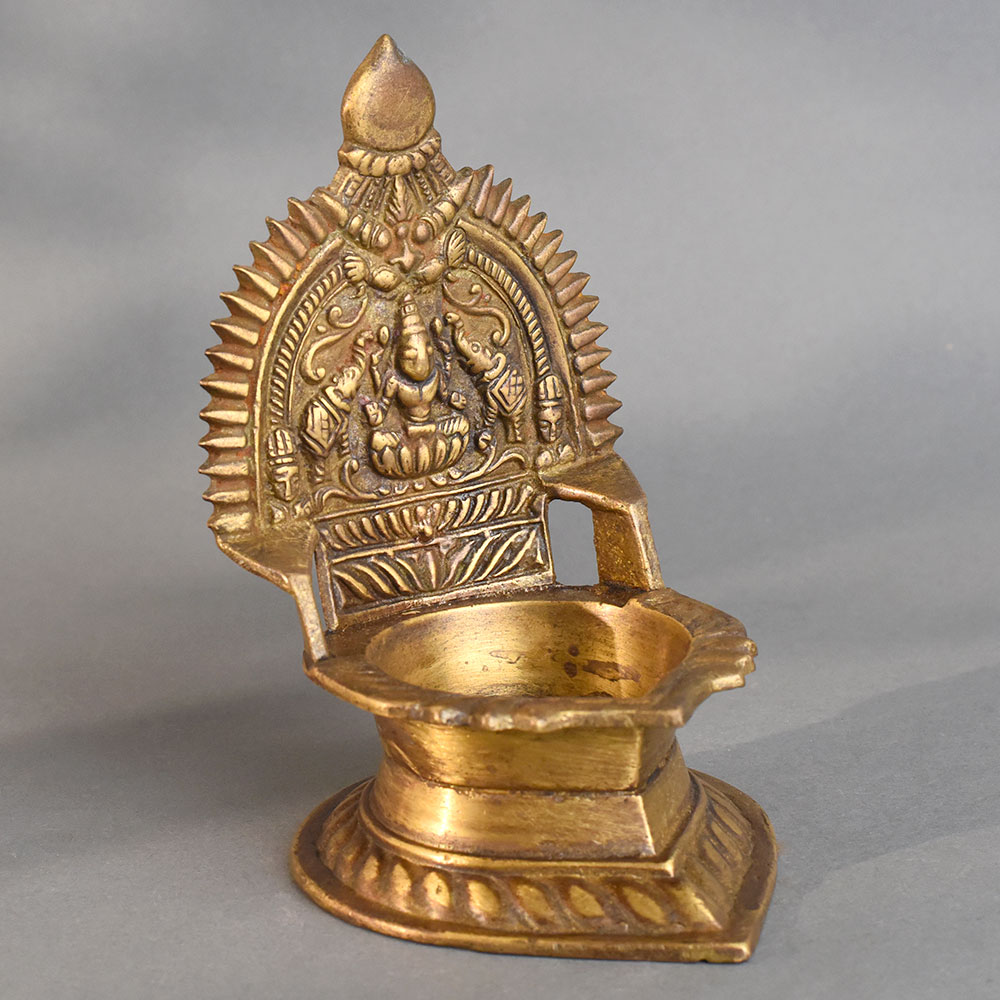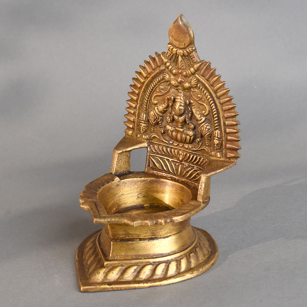 This handmade vintage brass pooja diya beautifully showcases South Indian artistry, featuring an intricate design of Lord Ganesha on the backplate. Symbolizing wisdom and prosperity, the diya is carefully crafted with traditional patterns that enhance its devotional value. Made from high-quality brass, it carries a timeless antique finish that adds authenticity and charm. Its deep oil-holding section makes it ideal for lighting during daily rituals, festive celebrations, or meditation practices. The sturdy base and ornate details reflect the rich heritage of temple-style craftsmanship, making it not only a functional lamp but also a spiritual and decorative centerpiece. Perfect for pooja rooms, home temples, and auspicious gifting, this diya radiates positive energy and cultural elegance.