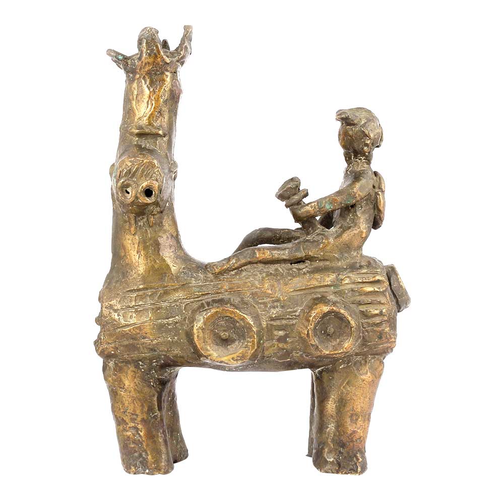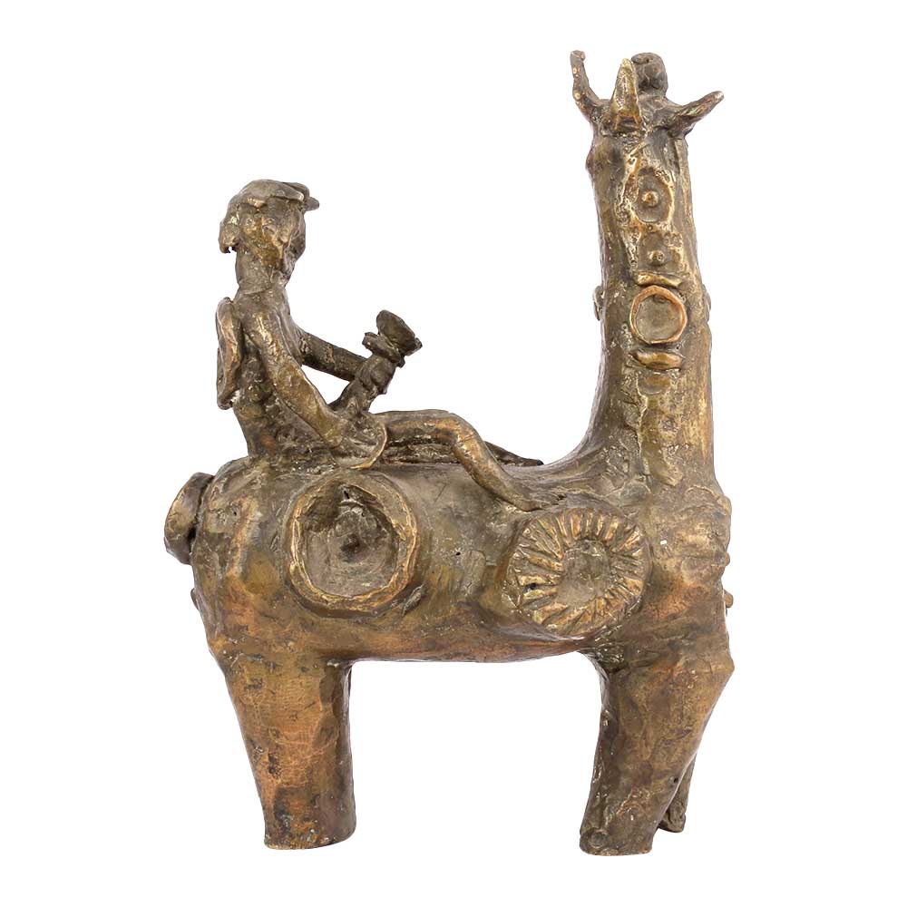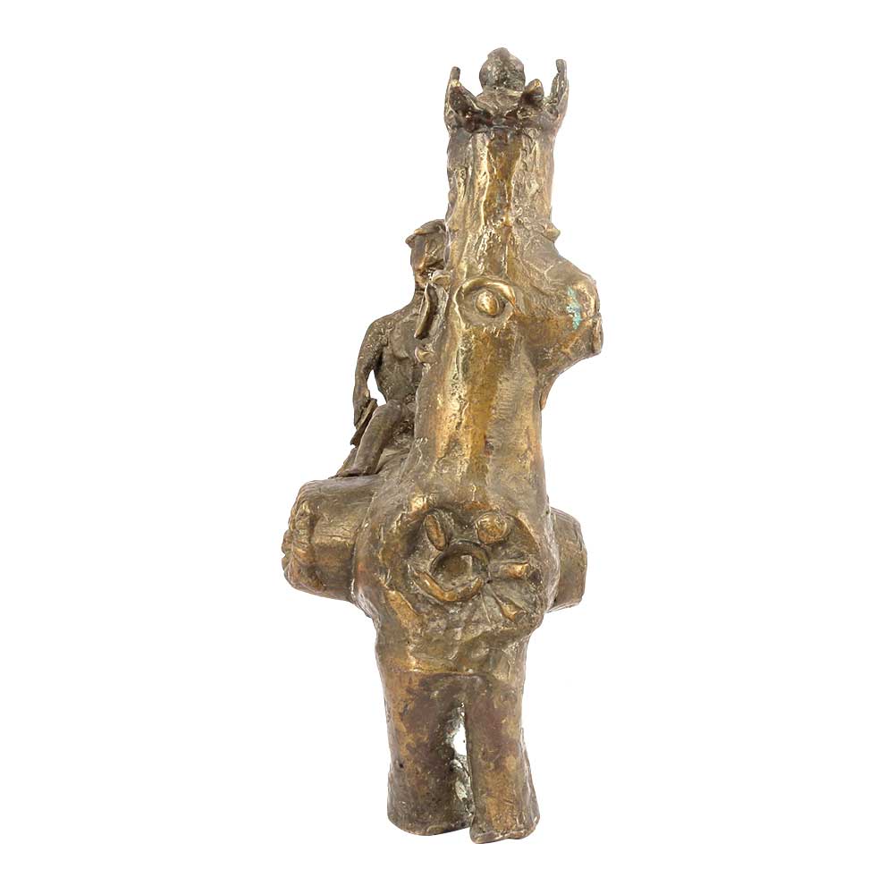 This Oxidized Bronze Statue is a Throwback to Fiercer Times of War and Cavalries. The Horse, Which is Outfitted in the Fittings of the Infantry of a Princely State, Up to the Crown on Its Head. Its Neck and Legs are in Beautiful Proportion with Carvings. The Rider, Seated in a Battle Saddle, to Ensure Stability; with the Full Decorative Items of One Who Heralds a Battle Call. He is of the Kind Who Play At Temples in Times of Peace.
