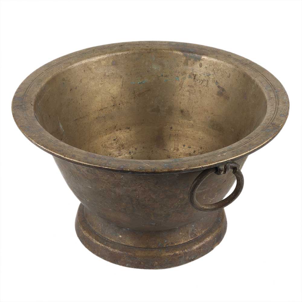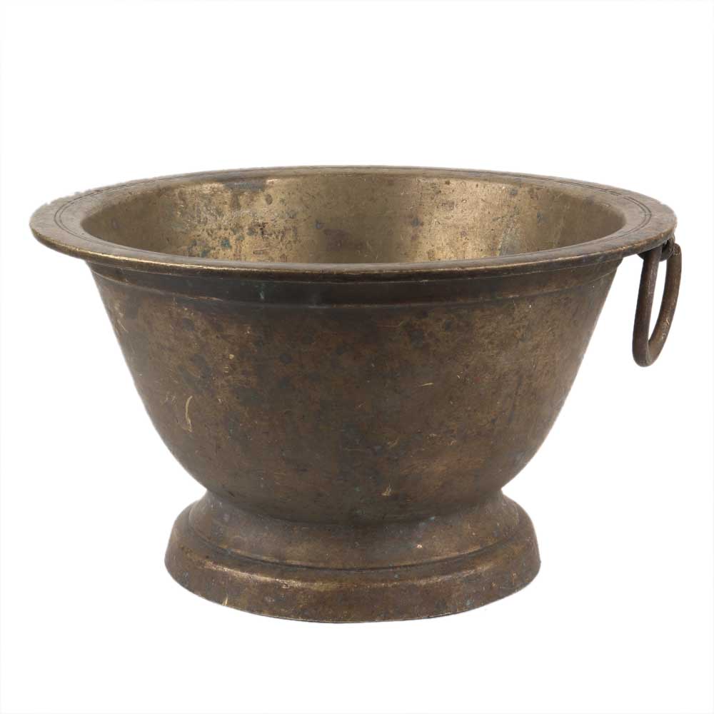 This is a primitive farmhouse French-style hammered brass mixing bowl. It is solid brass and has a brass ring for hanging. Ideal for vintage farmhouse decor the brass ring makes it easy to display and enjoy in a kitchen. This Round bottomed bowl piece would make a wonderful addition to an old-world-style kitchen.