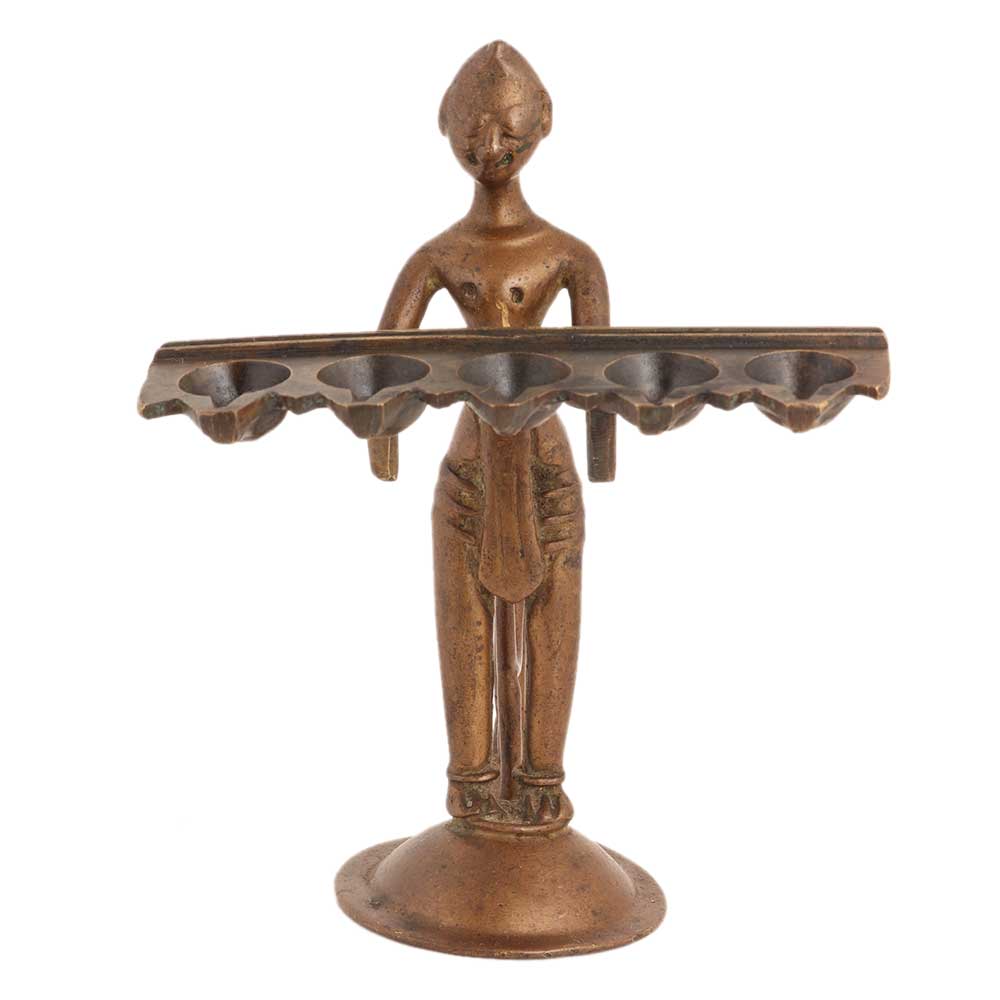 Handmade brass lady holding five faced oil lamp is a traditional diya, puja Item , spiritual decor, table decoration, diwali gift for your near and dear ones.
