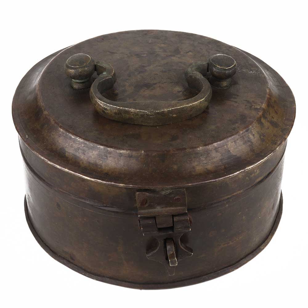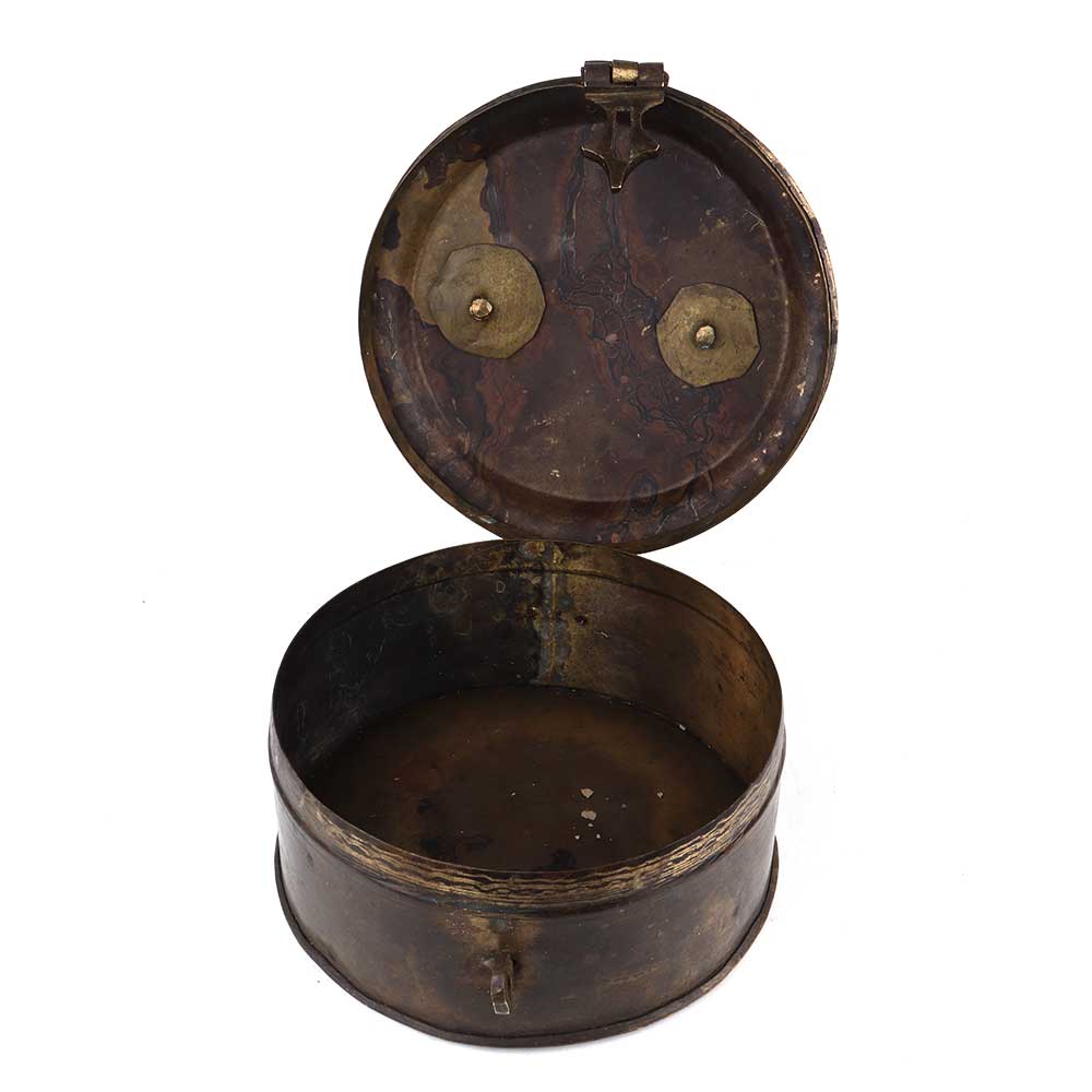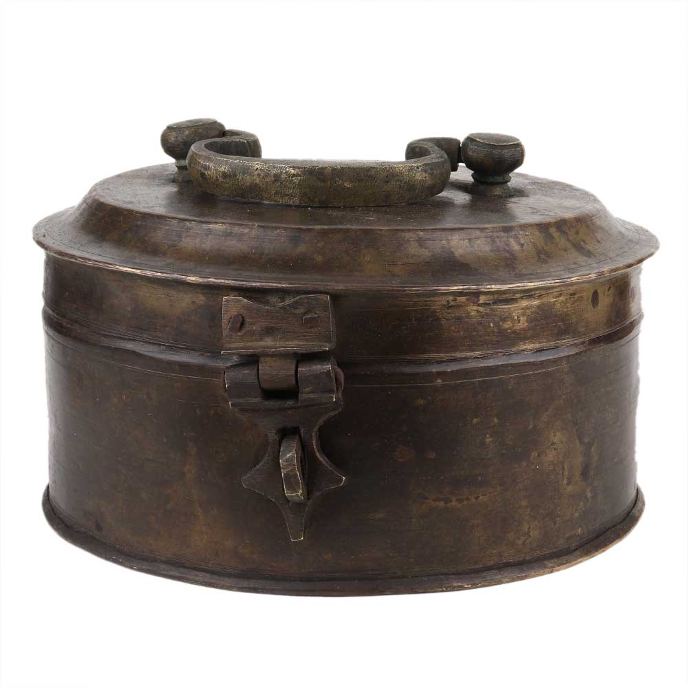 The decorative handmade round brass box with lid, latch, and handle makes it a perfect product for home decoration. This Box can be used as a treasure chest, an ideal gift for weddings or other social gatherings
