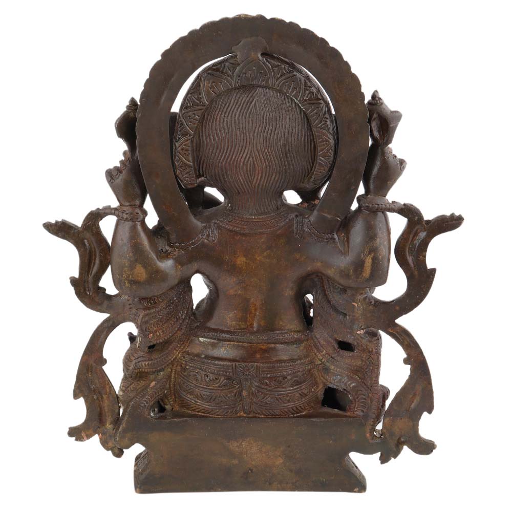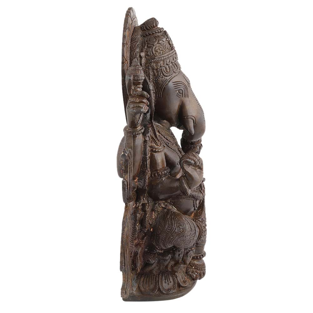 This auspicious brown brass sitting Ganesha murti or statue has intricate carvings and design that makes the perfect home decor accessory, showpiece, display it in home temple or puja Ghar. A good luck charm for your near and dear ones.