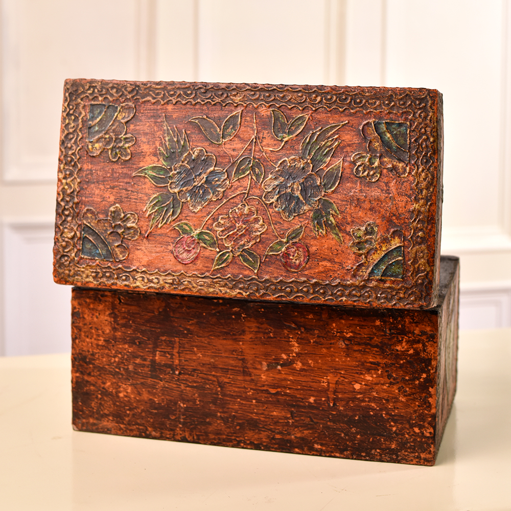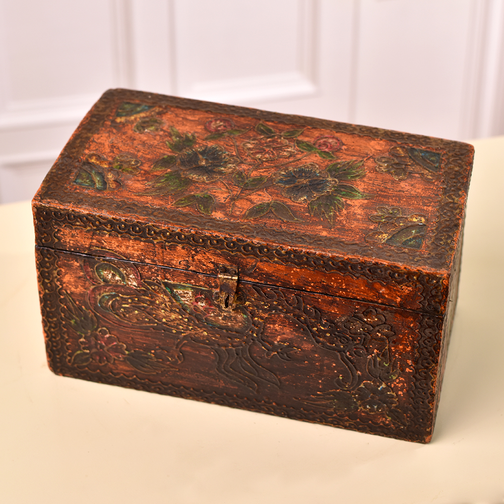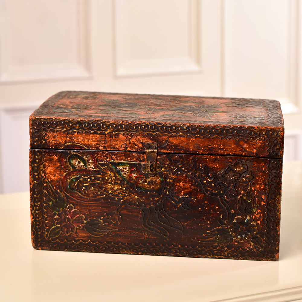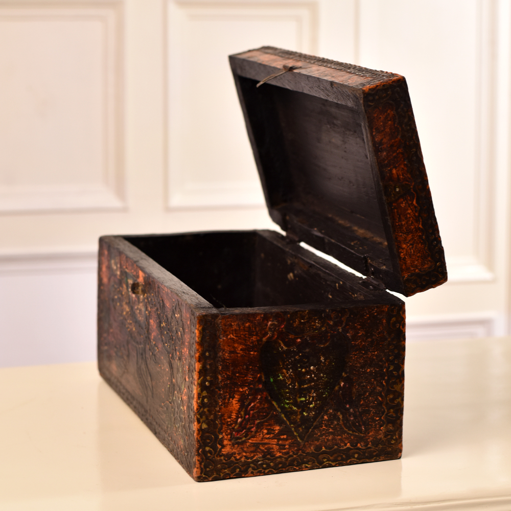 Buy a rectangular wooden box online that is a true masterpiece of craftsmanship and elegance. This beautiful box is adorned with intricate engravings that showcase the remarkable skill of Indian artisans, meticulously handcrafted from high-quality wood. Its antique brown finish adds a touch of timeless charm, making it a truly enchanting addition to your collection. This versatile box features a secure latch, making it perfect for safeguarding your precious jewelry and small keepsakes. Its spacious interior provides ample room for storing various treasures, ensuring your cherished items are always close at hand. Not only is this wooden box a practical storage solution, but it also serves as a captivating display piece. Its ornate engravings and rich, antique finish make it a conversation starter at any exhibition or gathering. This exquisite creation also makes for an ideal gift for your family, friends or relatives on special or festive occasions, expressing your affection with a touch of Indian artistry. Embrace the allure of this handmade masterpiece, blending tradition and functionality in one splendid package.
