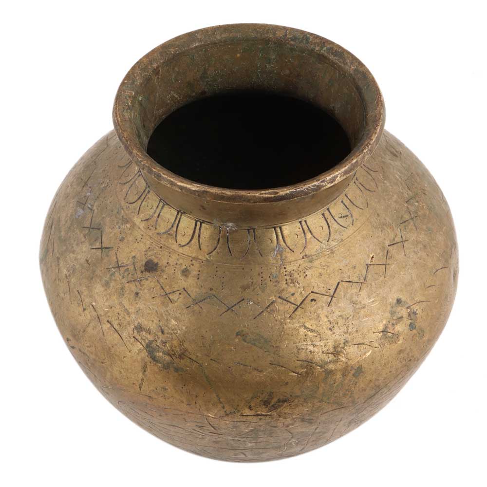 This rustic-style brass pot or lota can be used as a flower and planter pot to decorate the hotel, garden, lobby, lawn and club.