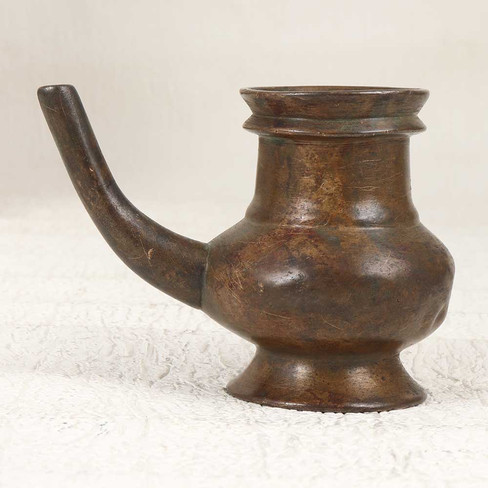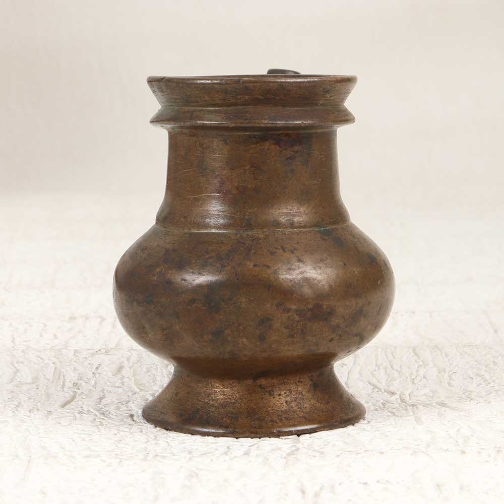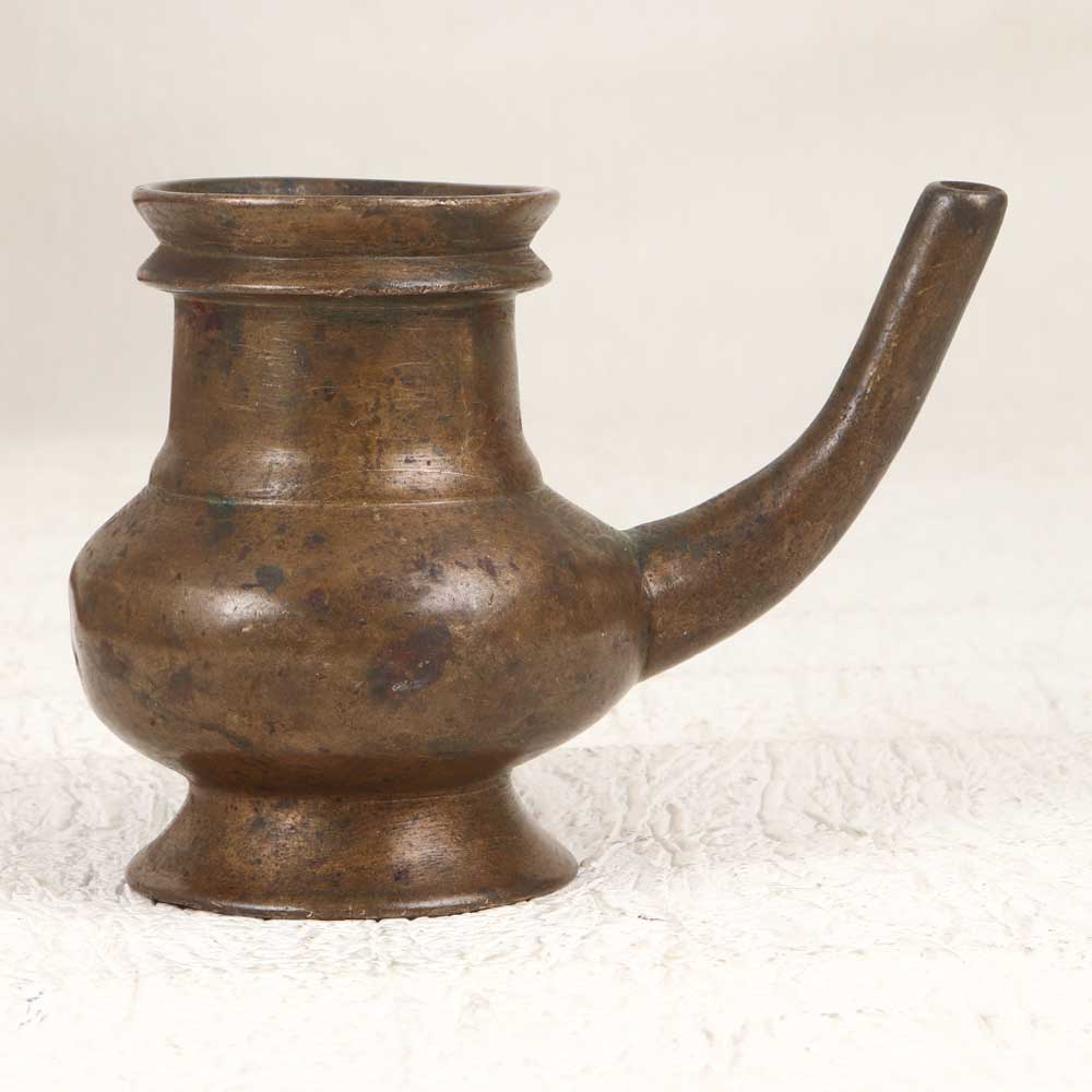 Step back in time with this antique brass holy water pot showcasing intricate South Indian artistry. Featuring a gracefully arching spout and sturdy handle, this vessel adds old world intrigue to any space. Display this brass pot prominently on your countertop or coffee table to infuse your home with exotic, artistic charm. The eye-catching Indian motifs and handcrafted appeal make a stunning decorative statement. Use the pot functionally to hold water for guests or spiritual rituals. For antique lovers and world culture enthusiasts, this holy water vessel is a special find. The vintage brass styling and nod to South Indian art create an intriguing, one-of-a-kind focal point. Let this beautiful pot transport you to another time and place.