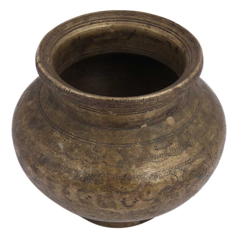 This brass pot features a gorgeous carved pattern of leaves and flowers in the centre and border. It can be used as a place of worship. In the pooja room, temples are used to keep holy water or to serve as a kalash. It has a patina to it.