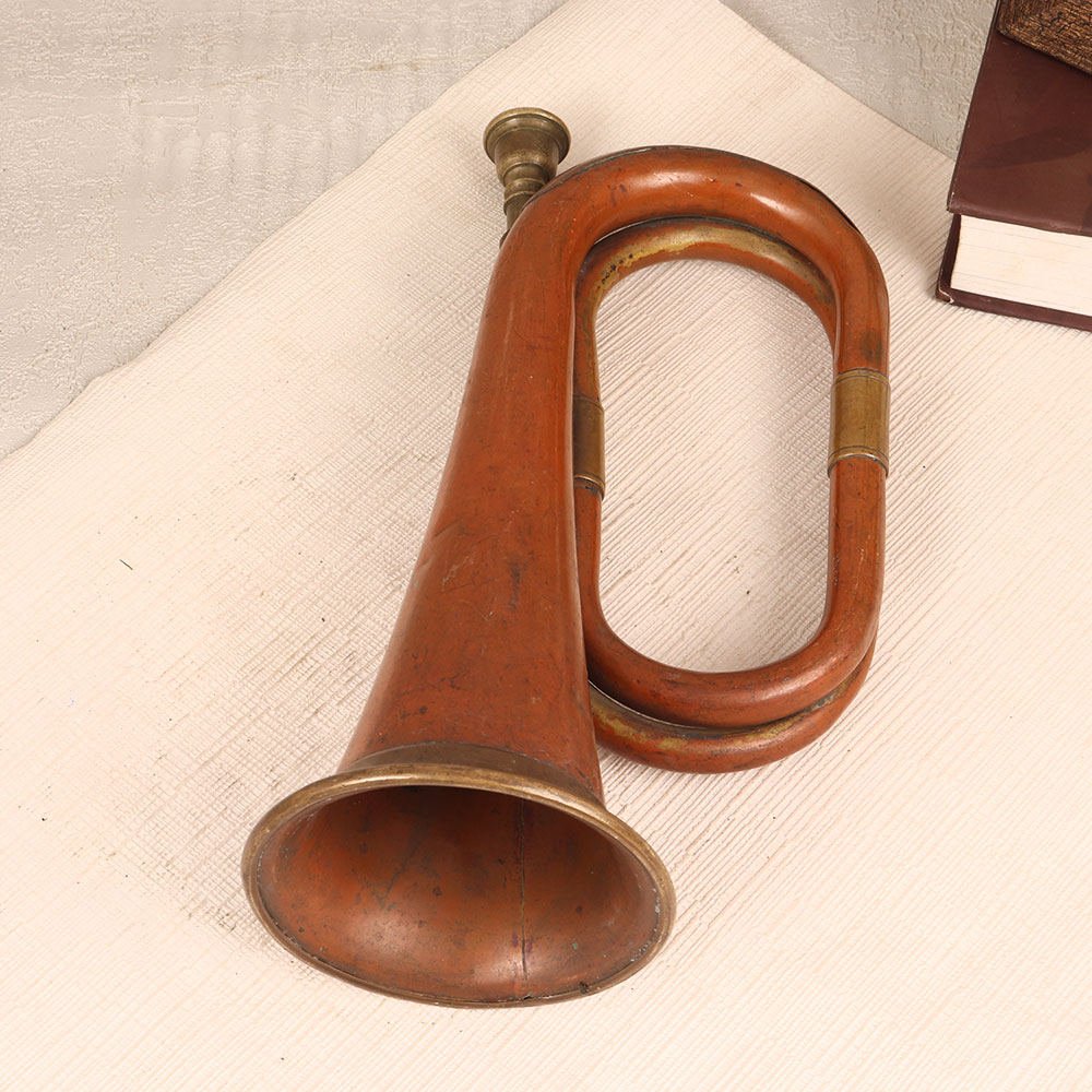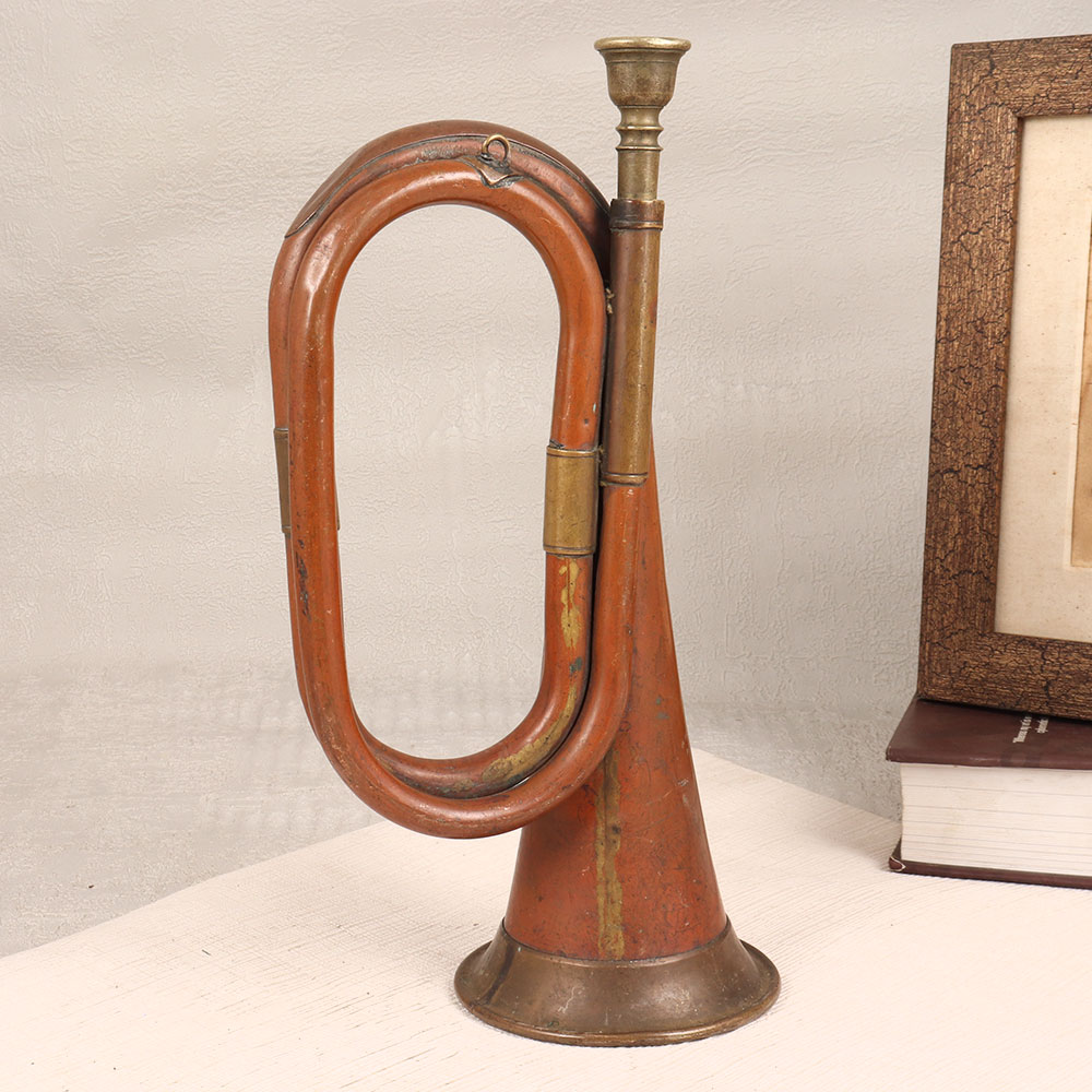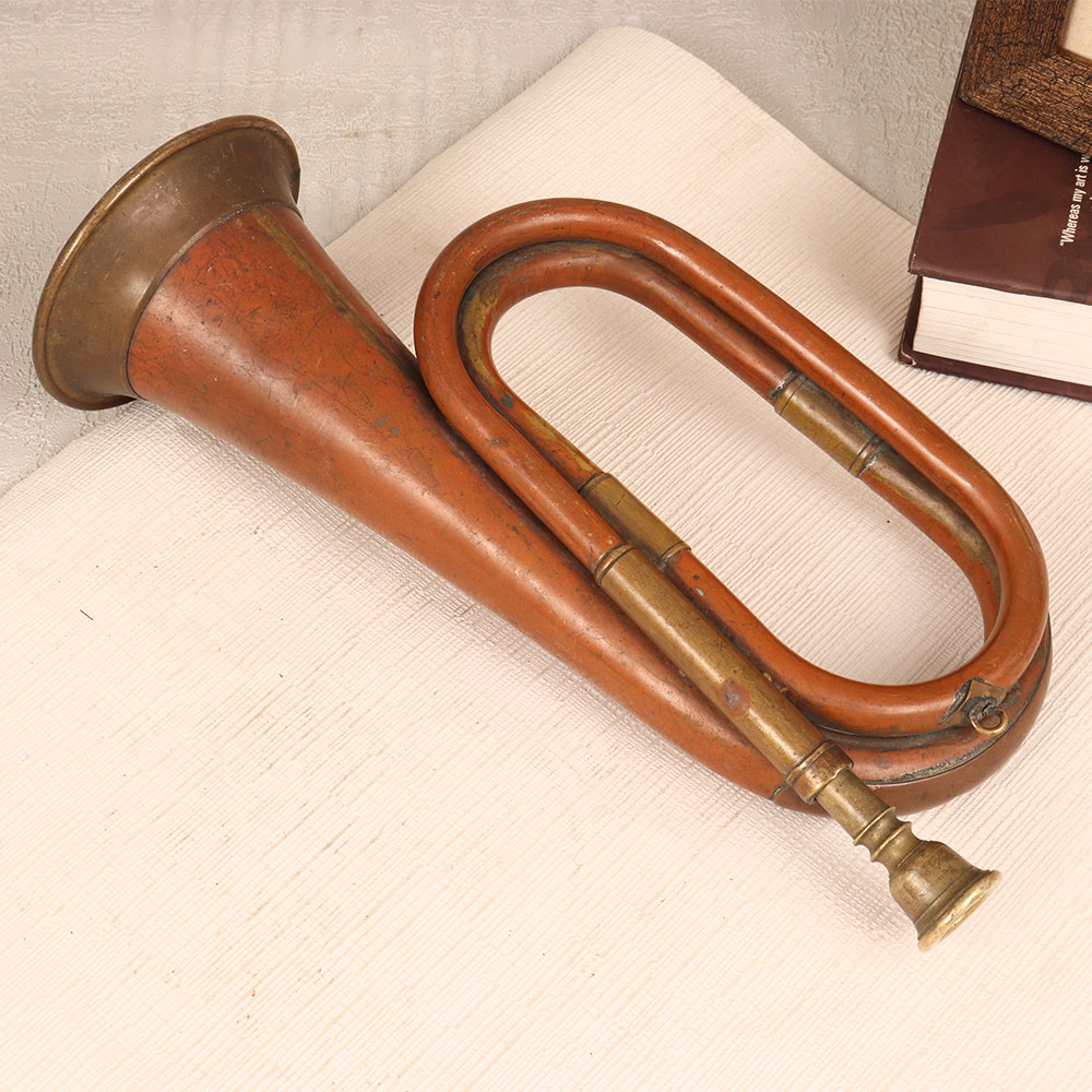 A Vintage Brass and Copper Bugle that is a masterpiece crafted by highly talented artisans in English Art. Meticulously handmade from high-quality brass and copper, this musical instrument boasts a rich antique brown finish that exudes a sense of nostalgia and sophistication. The bugle, with its classic design, adds a touch of elegance to any setting, be it your home, office, restaurant, hotel, or cafe. Its versatile appeal makes it a captivating decorative piece that seamlessly blends with various interior styles. Whether placed on a mantel, a shelf, or as a centerpiece, this bugle serves as a conversation starter and a testament to the beauty of craftsmanship. This exceptional bugle isn't just a decorative piece, it's an exquisite addition to any vintage collection. Its historical allure and artisanal quality make it a noteworthy heirloom that stands the test of time. Consider this Vintage Brass and Copper Bugle as a thoughtful gift for your family, friends or relatives on special, festive, or auspicious occasions. Celebrate the artistry of the past and create lasting memories with this unique and beautifully crafted musical instrument.