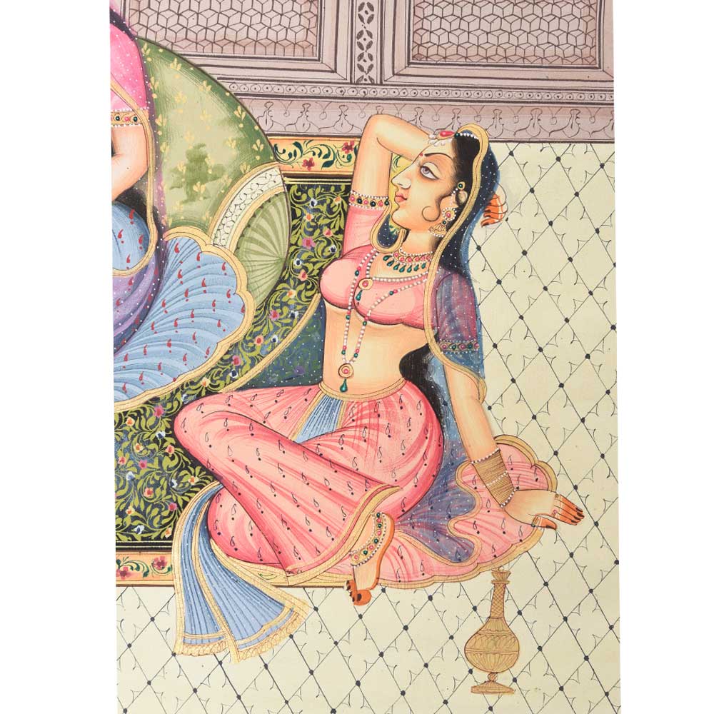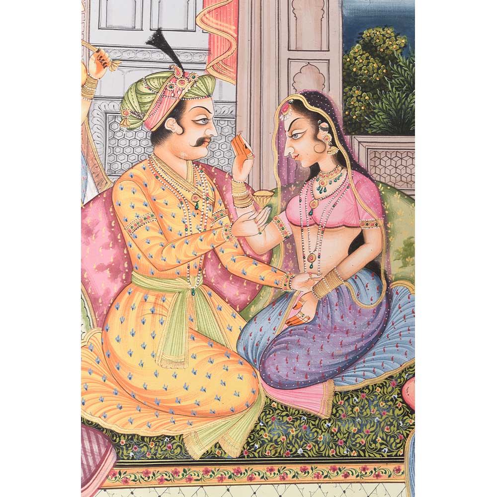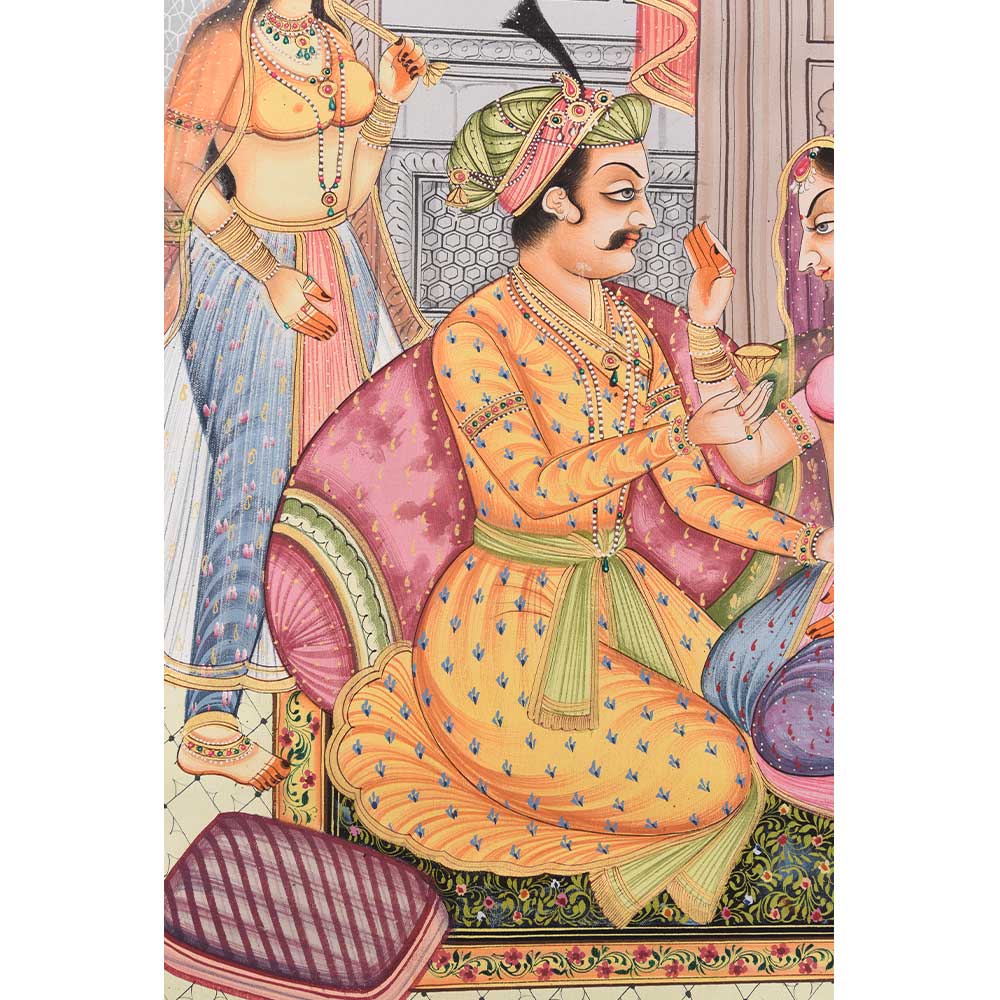 This handmade Mughal painting has a timeless charm with bright colours that instantly adds glamour to dull walls. It is perfect for enriching up your home, office, club, and restaurant.