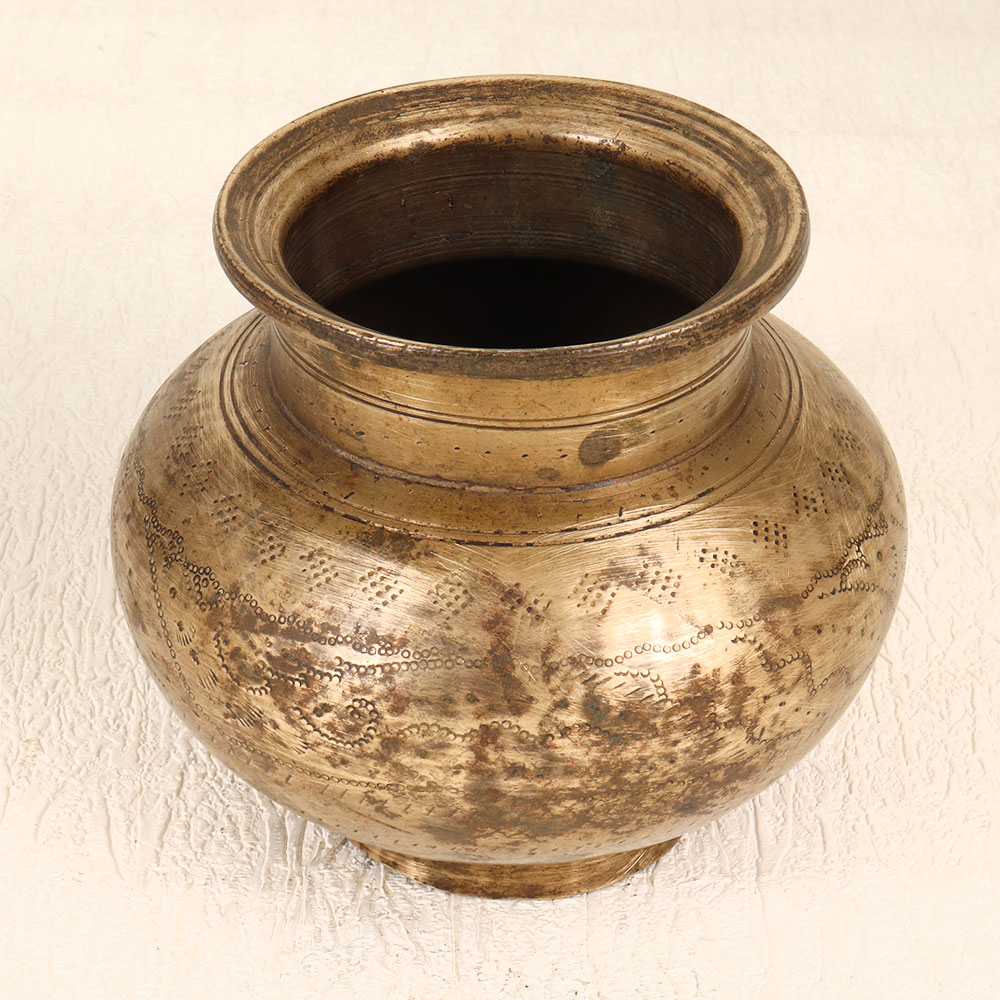 Buy a Vintage Brass Holy Water Pot online which is a masterpiece meticulously crafted by professional Indian artisans in the revered South Indian Art tradition. This exquisite pot serves as a sacred vessel during prayers, rituals, and havans, holding the purity of holy water with grace and reverence. Made from high-quality brass, the pot boasts an antique brown finish that adds a touch of rustic elegance. Its engraved detailing showcases the artisan's dedication to precision and traditional craftsmanship, making it a captivating piece for any collector of vintage treasures. Versatile and sacred, this pot finds a harmonious place in homes, offices, restaurants, hotels, or cafes, enhancing the ambiance of prayer rooms with its divine aura. Beyond its religious utility, the pot transforms into an indoor flower pot, marrying functionality with spirituality. Embrace the rich cultural heritage embedded in every inch of this handmade masterpiece, a testament to the skilled hands that brought it to life. The Vintage Brass Holy Water Pot makes for a thoughtful and meaningful gift for your family, friends or relatives on special, festive, or auspicious occasions, imparting blessings and tradition in every drop it holds.