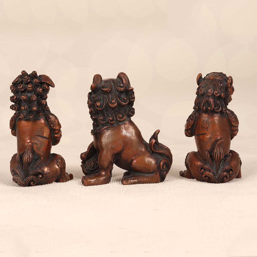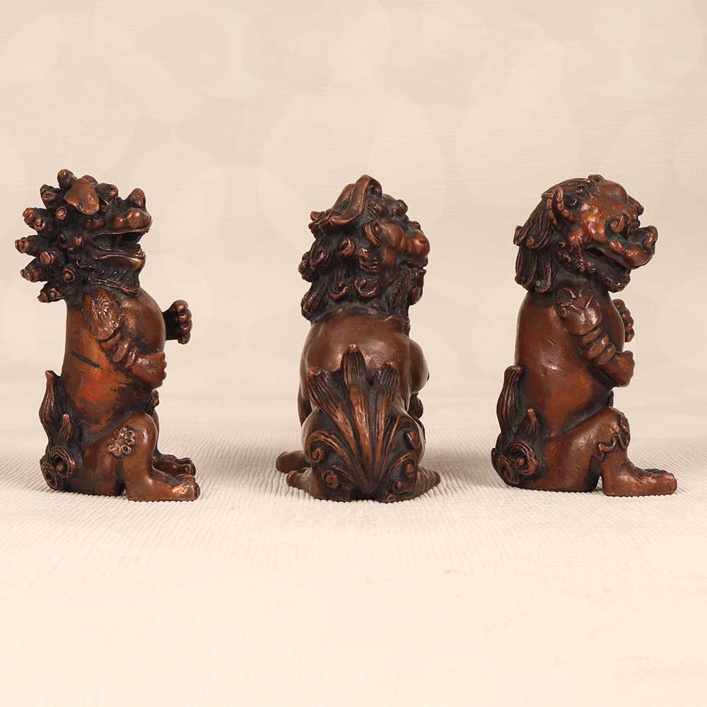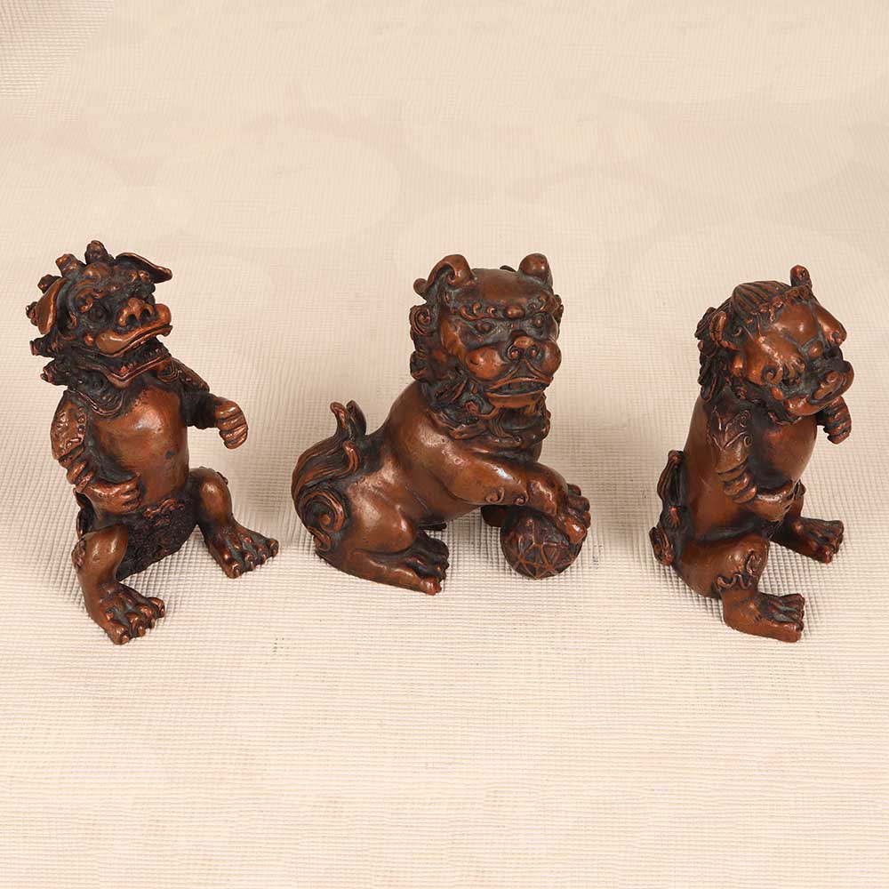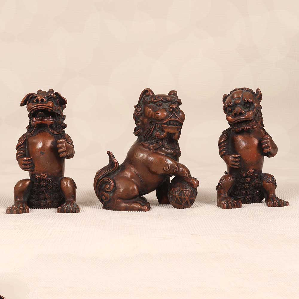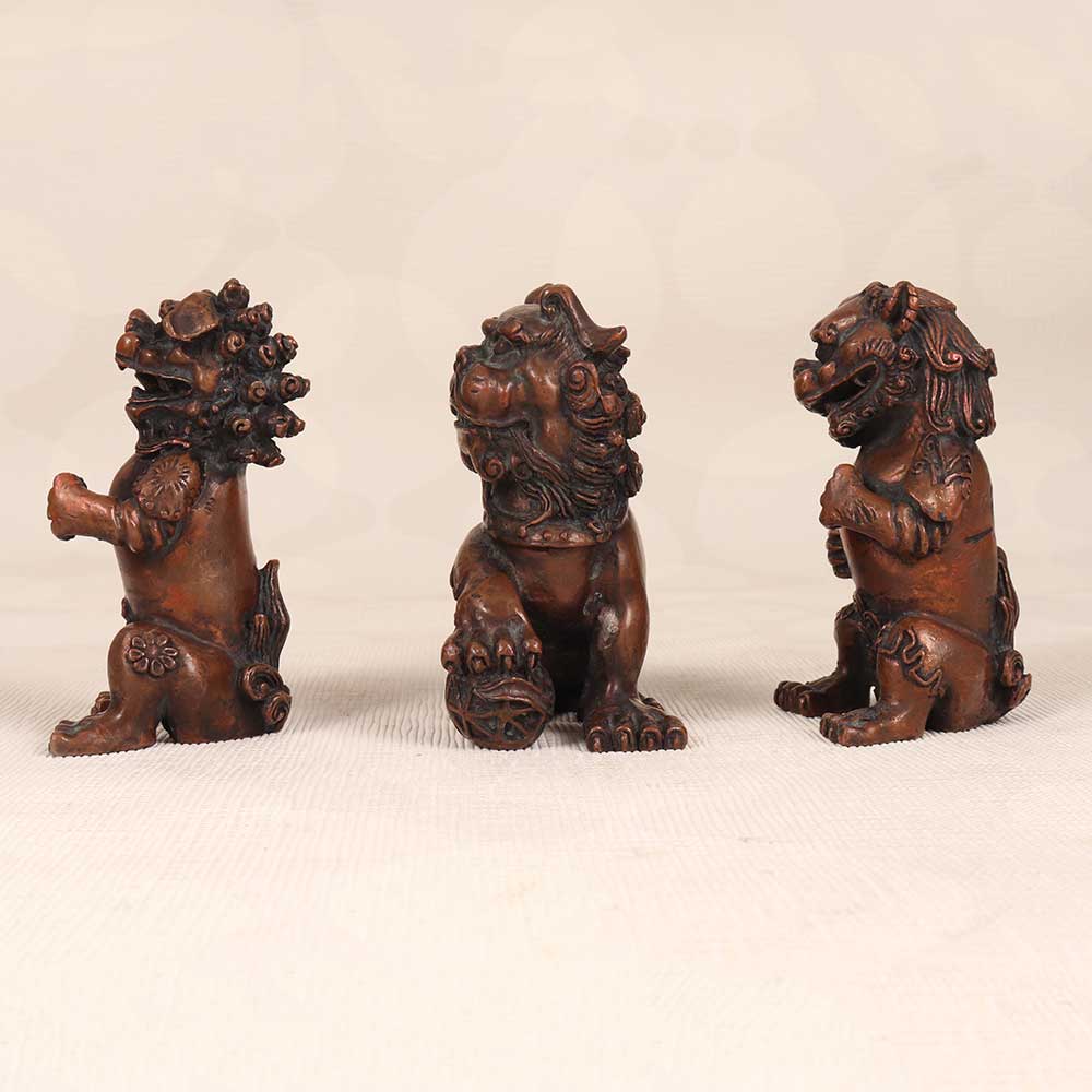 Make a Bold Statement with this Set of 3 Vintage Metal Chinese Lion Statues. Modeled after the legendary guardians of ancient Chinese palaces and temples, these finely wrought metal statues possess an air of strength and nobility. Their detailed craftsmanship honors the artistry of classic Chinese design. With one lion playfully holding a ball and the others in seated poses, this trio brings a sense of whimsy and wonder to any space. Place them on an entryway table to greet guests with an exotic flair. Arrange them on your patio or in your garden for a majestic oriental accent. Wherever you display these striking statues, they become an impressive focal point that sparks curiosity and comment.