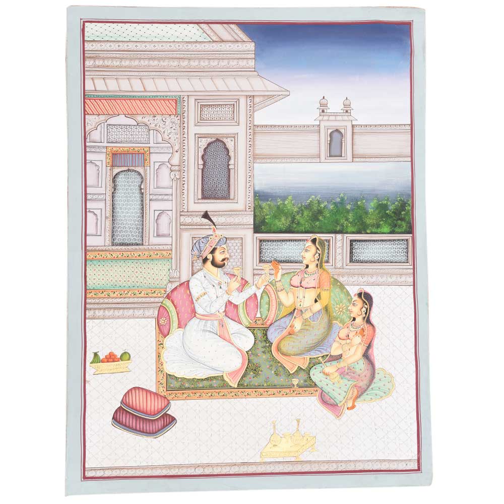 You will love this magnificent Canvas Mughal painting that captures Emperor with musical intermissions, wine, and rhythmic dance in the open harem courtyard on the terrace.