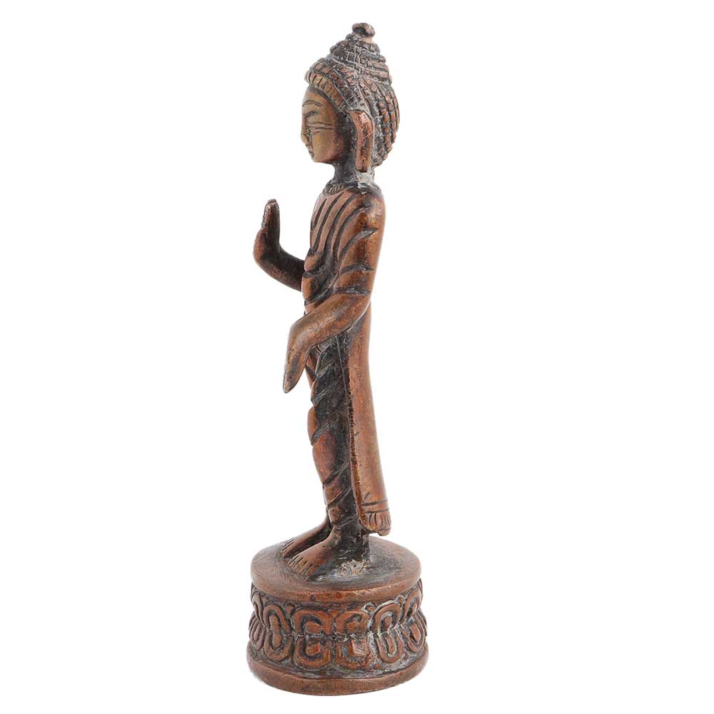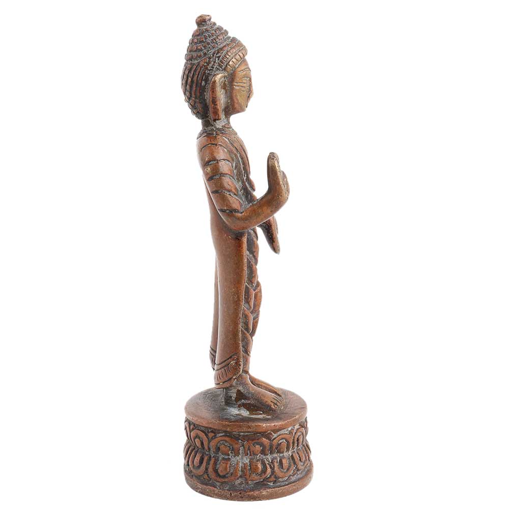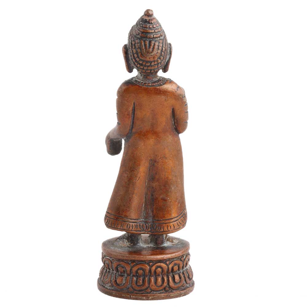 Standing Brass Buddha statue in the house and garden can be used in Feng Shui applications to improve personal orientation and energize weakened areas of life. It comes with a lovely copper finish.