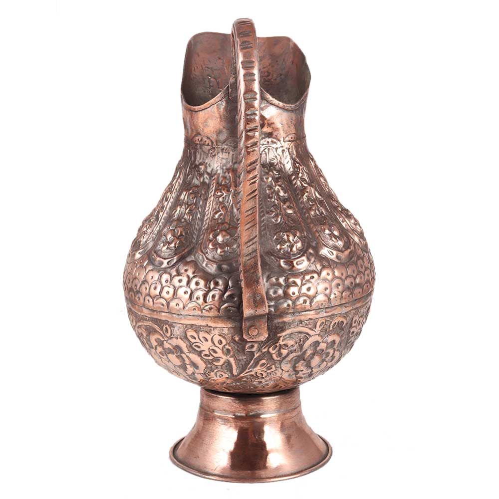 Pitcher in Islamic tinned copper Baluster-shaped jug with a round raised platform base and a scrolled curved handle with a wild terminal. The surface is repousse and heavily hand chased, with convex panels containing leafy floral sprays in low relief. The tin finish is slightly worn and has a nice age patina, indicating its age and usage.