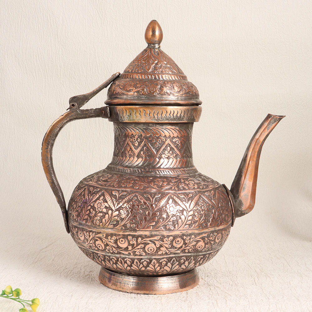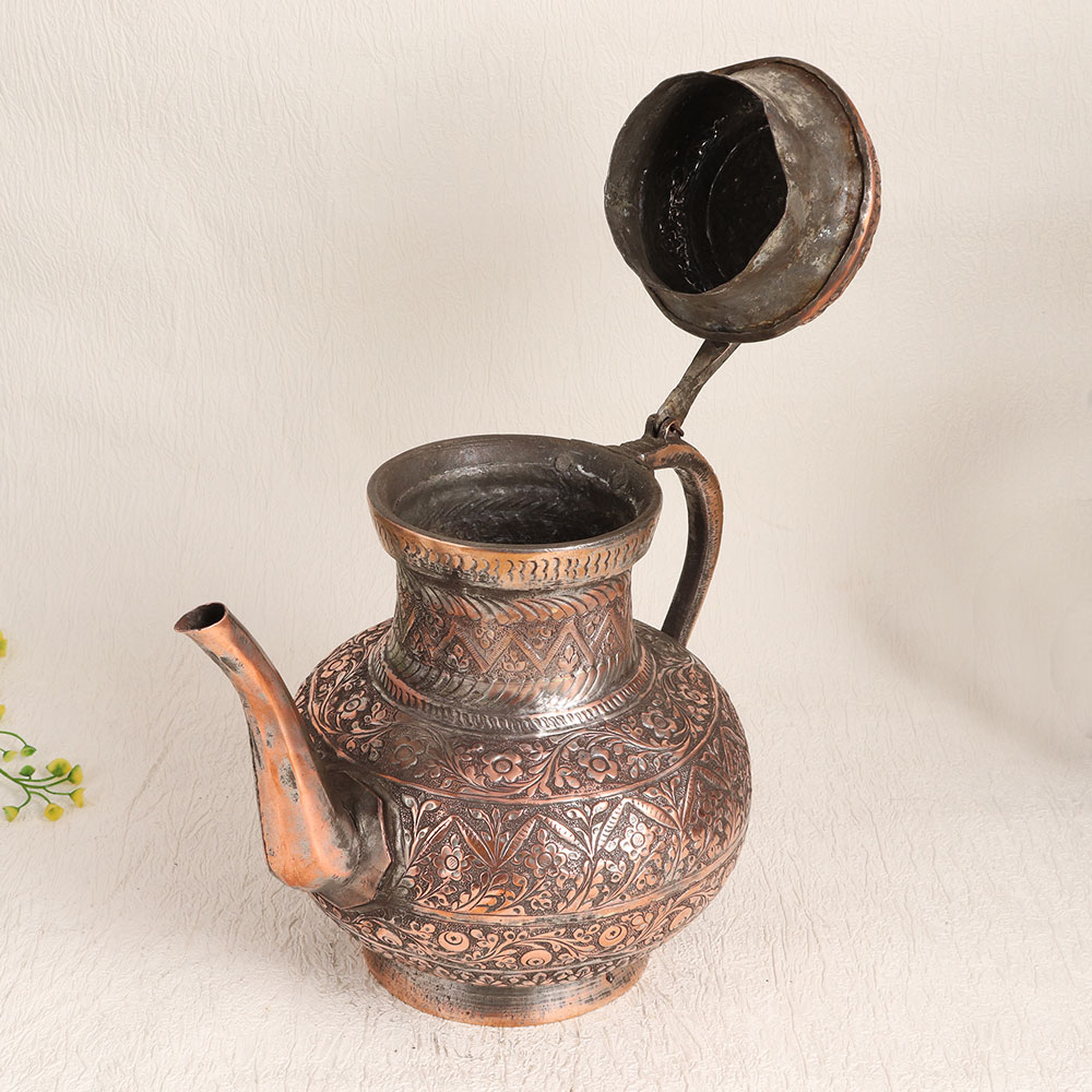 Enhance your decor with the timeless elegance of this exquisite Vintage Copper Kettle. Crafted by highly talented artisans in the tradition of Islamic Art, this stunning piece is a testament to craftsmanship and history. The kettle features intricate engravings that showcase the artistry and attention to detail that went into its creation. Its antique brown finish adds warmth and character to any space, making it a versatile addition to your home, office, restaurant, hotel, cafe, or shop. While it can be used as a functional kettle, we recommend reserving it for decorative purposes due to its vintage nature. Place it as a charming centerpiece, use it as a unique flower pot, or incorporate it into your vintage collection or exhibition display. This vintage copper kettle also makes for a thoughtful and memorable gift for your family, friends or relatives on special, festive, or auspicious occasions. Whether you cherish it for its historical significance, appreciate its artistic beauty, or simply admire its unique charm, this vintage copper kettle is sure to be a cherished addition to your space and a conversation starter for years to come.
