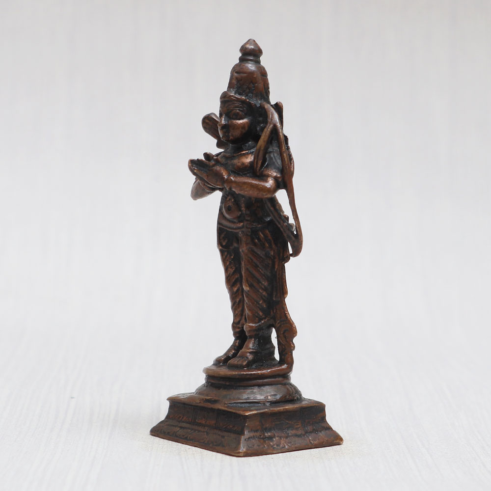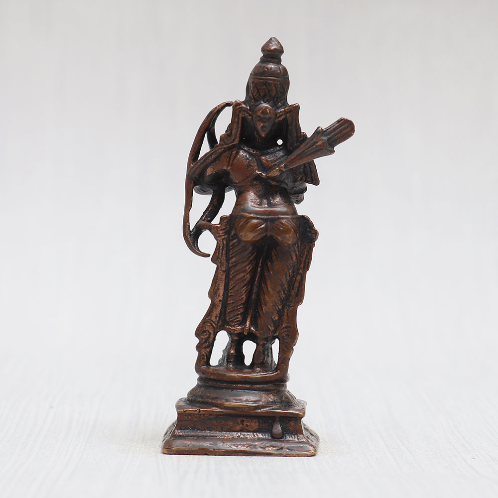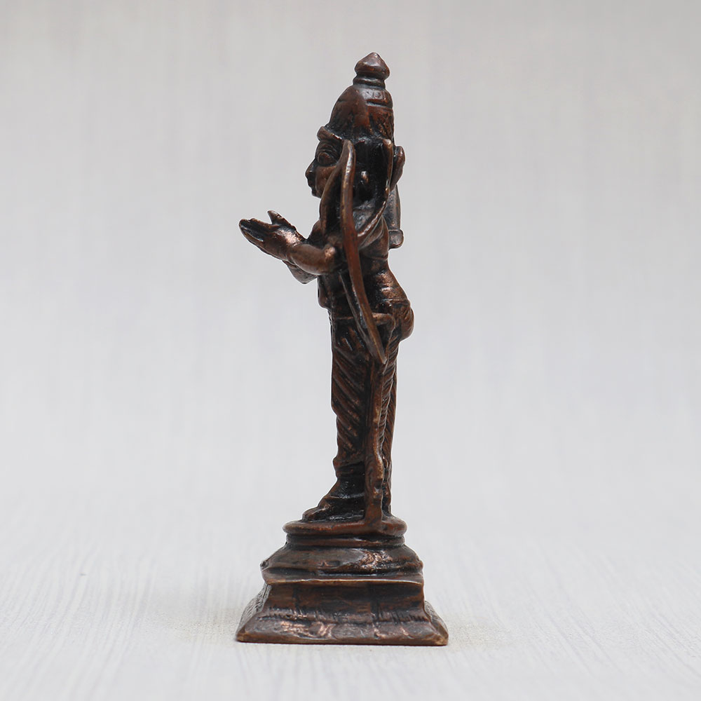 This copper statue of Lord Ram is crafted with utmost devotion by skilled Indian craftsmen. This awe-inspiring piece showcases Lord Rama standing gracefully, his hands folded in reverence. Adorned with intricate detailing and a vintage-style finish, the statue exudes a timeless charm. Carrying a bow on his left shoulder and a quiver of arrows on his back, this divine masterpiece captures Lord Ram's heroic and benevolent essence. Ideal for your prayer room at home, office, restaurant, cafe, or shop, it serves as a captivating item for decoration, collection, and exhibitions. Embrace the spirituality of your space by placing this divine creation in your temple for worship. It's the perfect gift for your family, friends or relatives on special, festive, or auspicious occasions. Now you can easily buy idols online, including this enchanting Lord Ram statue, and bring the divine aura to your surroundings. Find a wide selection of Hindu god statues online and elevate the ambiance of your sacred space.