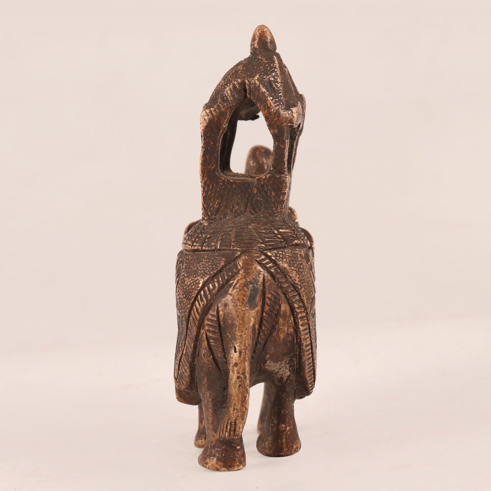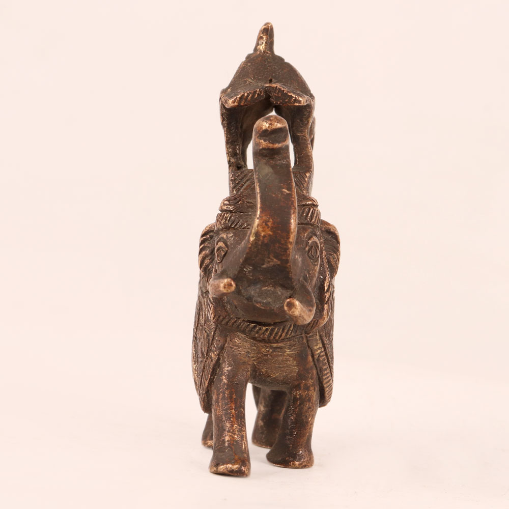 Elevate your space with the timeless elegance of our vintage copper elephant statue, a stunning piece of artistry that pays homage to India's rich cultural heritage. Handcrafted with meticulous attention to detail by talented Indian artisans, this exquisite masterpiece boasts an antique brown finish that exudes sophistication and charm. The elephant is adorned with a magnificent howdah, intricately engraved with beautiful designs that showcase the artisan's craftsmanship. Its vintage appeal makes it a versatile addition to any setting, whether it's your home, office, restaurant, hotel, cafe, or shop, instantly adding a touch of opulence and cultural significance to your decor. For collectors of vintage treasures, this copper elephant is a must-have addition to your prized collection, embodying the essence of historical India. Furthermore, it makes for a thoughtful and meaningful gift for your family, friends or relatives on special, festive, or auspicious occasions, symbolizing luck, wisdom, and prosperity. With this stunning copper elephant statue, you'll bring a piece of Indian tradition and artistry into your life, creating an enduring statement of beauty and culture.