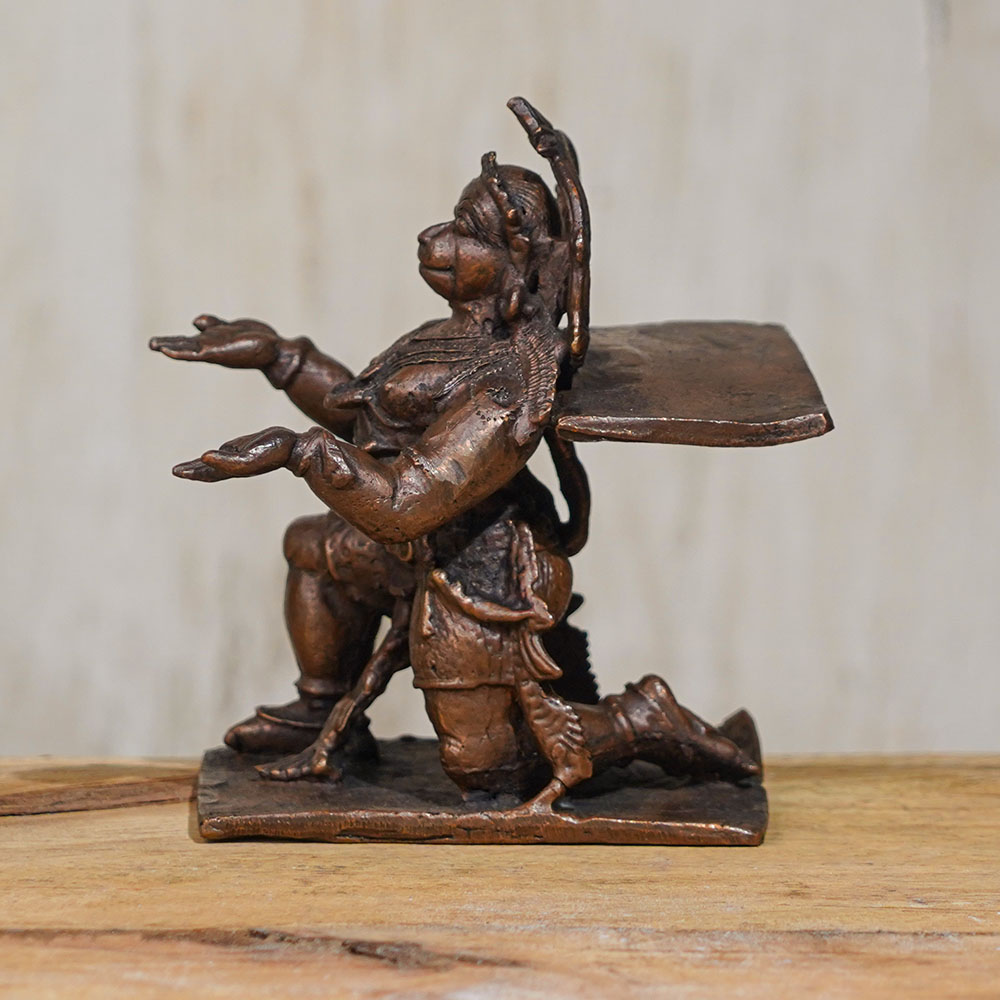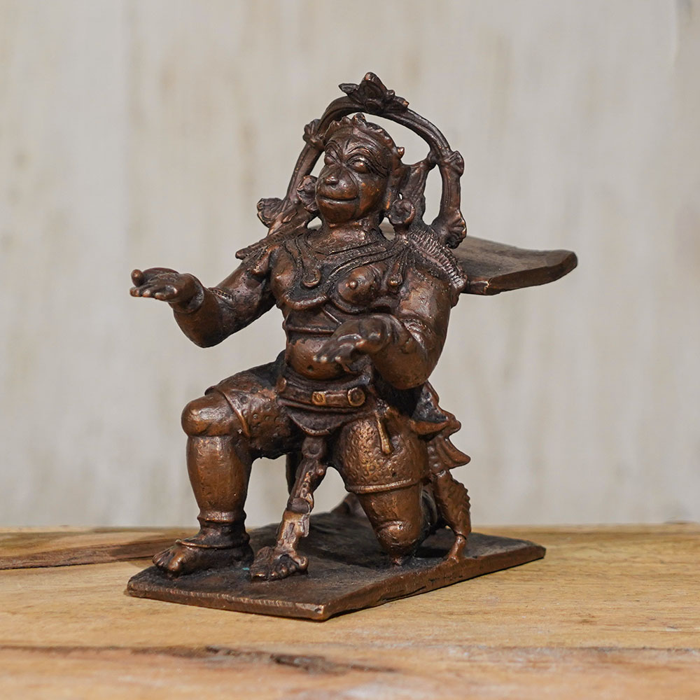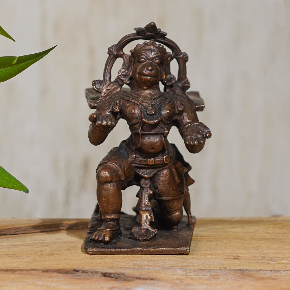 Experience the divine presence of Lord Hanuman with this exquisite copper statue, meticulously handcrafted by skilled Indian artisans. This Lord Hanuman murti is a true masterpiece, featuring intricate details that capture the essence of this revered Hindu deity. This copper statue of Lord Hanuman is perfect for adorning your prayer room, collection, or as a thoughtful gift for your loved ones. Lord Hanuman is a symbol of strength, devotion, and courage, and is widely worshipped in many Indian temples. Made with high-quality copper, this Lord Hanuman idol is not only a sacred symbol for worship, but also a beautiful piece of art that adds grace and elegance to any space. Its exquisite craftsmanship and attention to detail make it a cherished addition to your spiritual practice or home decor. With the option to buy Lord Hanuman statue online, this copper murti is a perfect choice for devotees seeking a divine representation of Lord Hanuman, handcrafted with love and devotion by skilled Indian artisans.