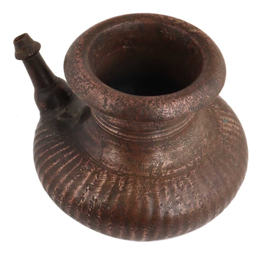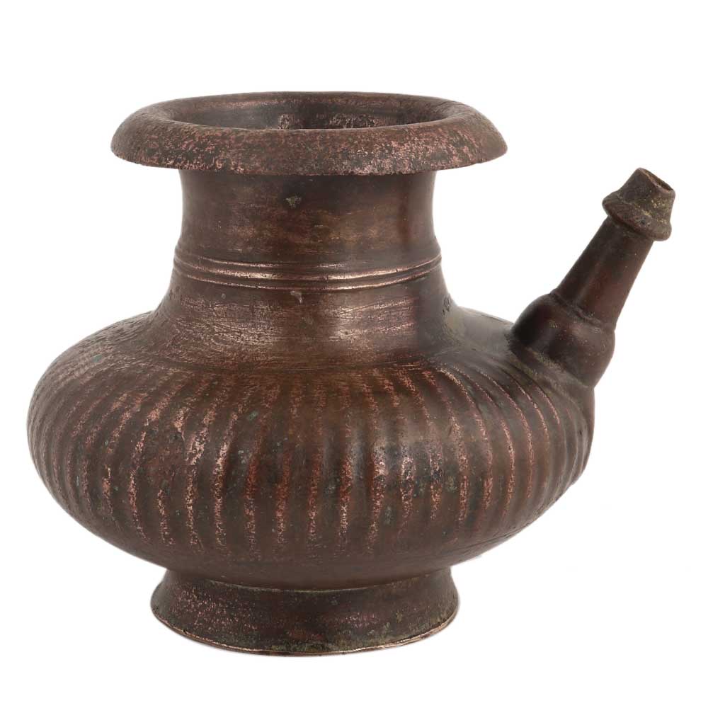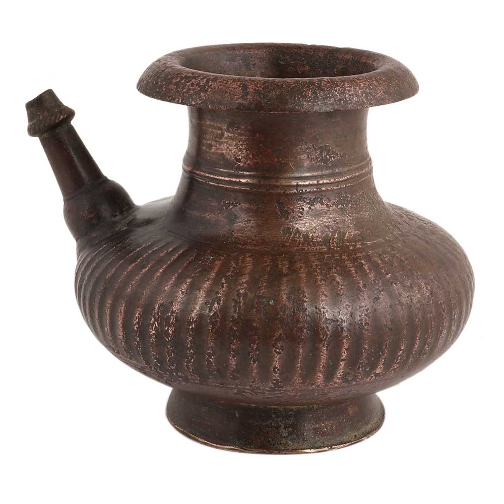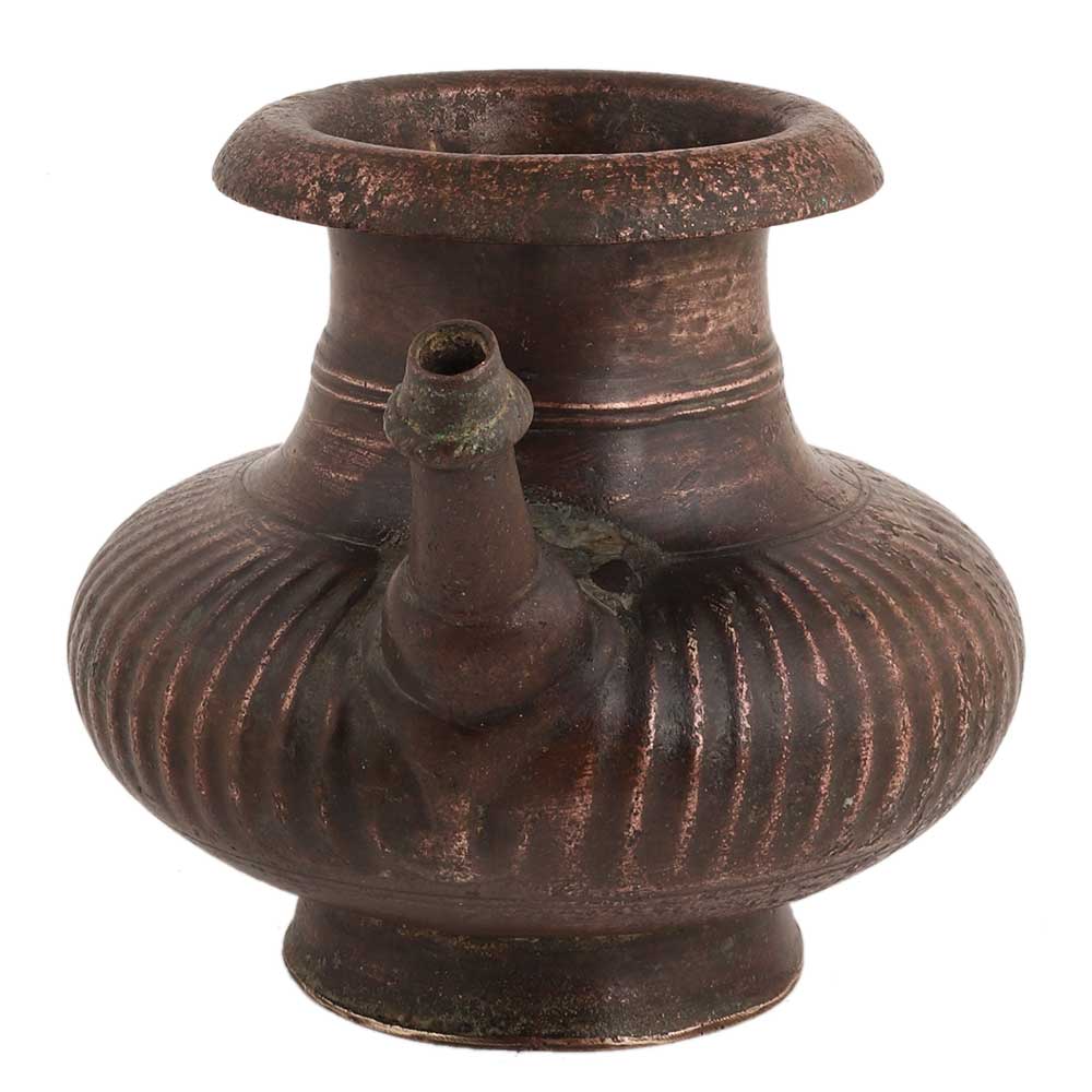 A heavy solid brass pot in a fluted design with a spout has a lovely round shape to store holy water. It's a perfect gift for vintage lovers, for a personal collection.