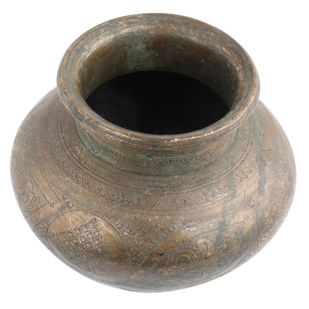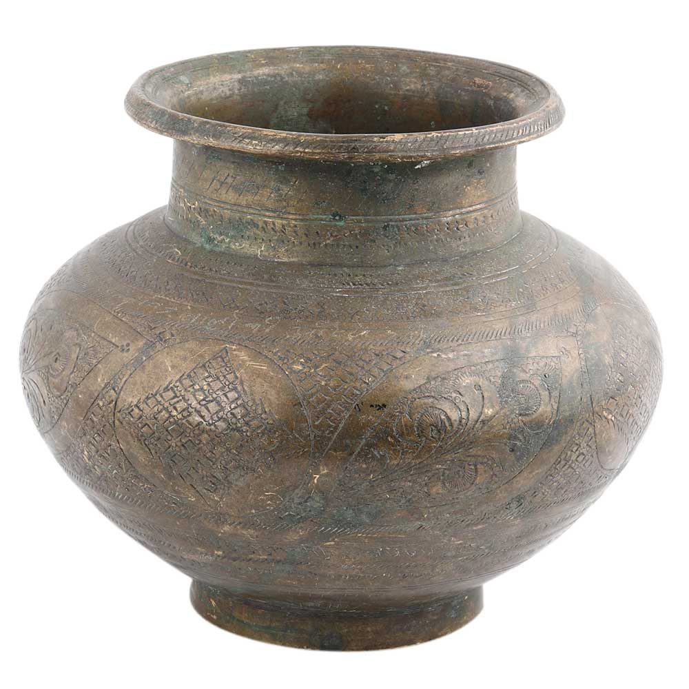 This hand-carved brass pot can be used as a puja container, water pot, or vase. It is also a planter, flowerpot, or decorative pot. Use it for gifting.