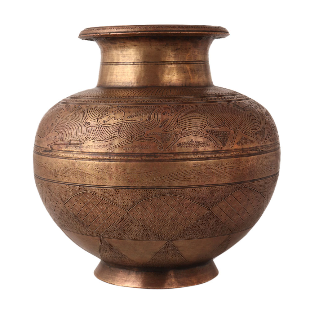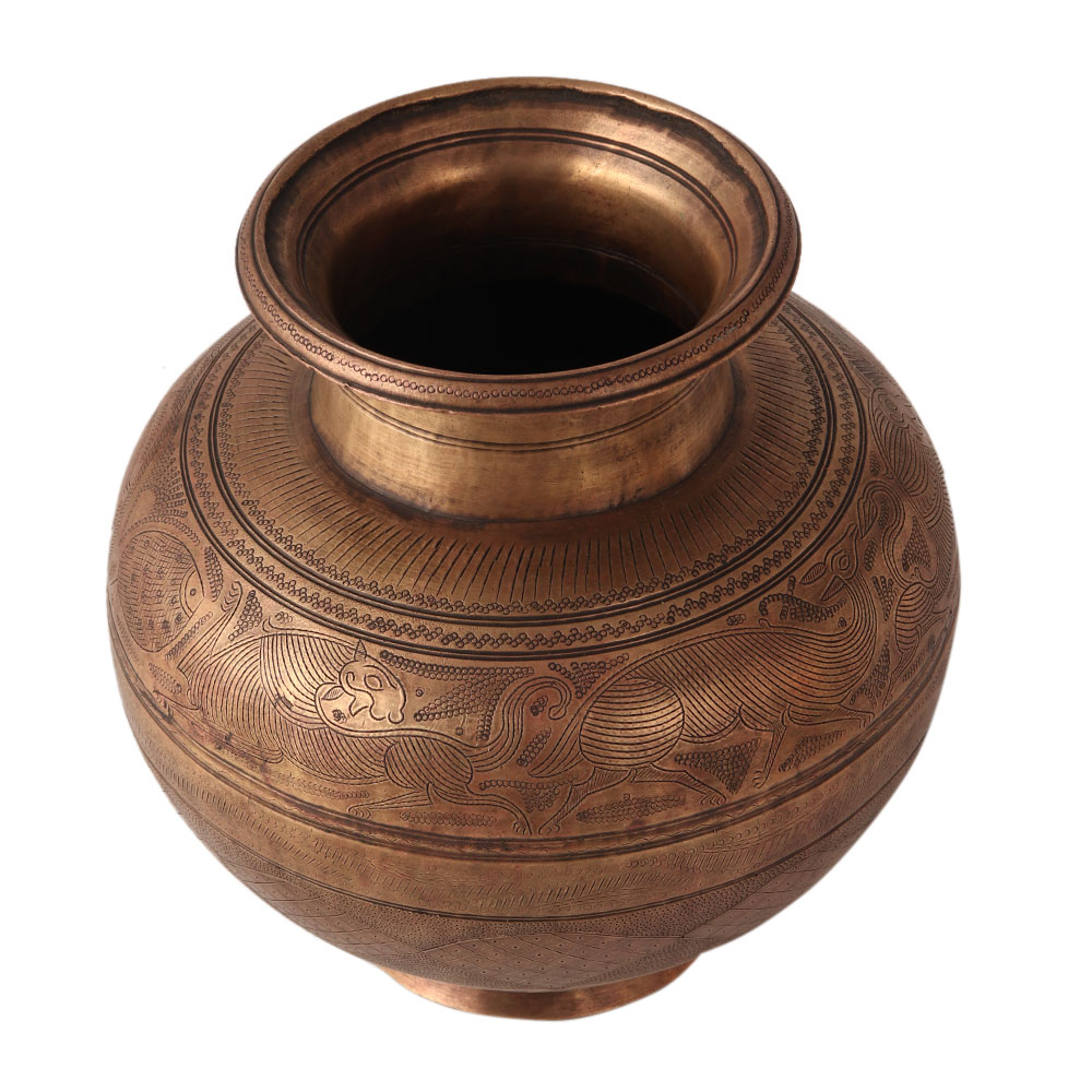 The engraved bronze Gangajal pot is handcrafted locally by skilled Indian artisans. It has an immaculate design with engraved animals like deer and horses. The details of the design are so perfect. It is the first choice for vintage collectors to display in their collection.