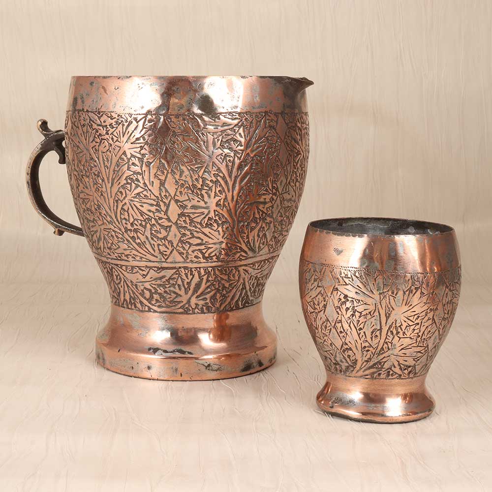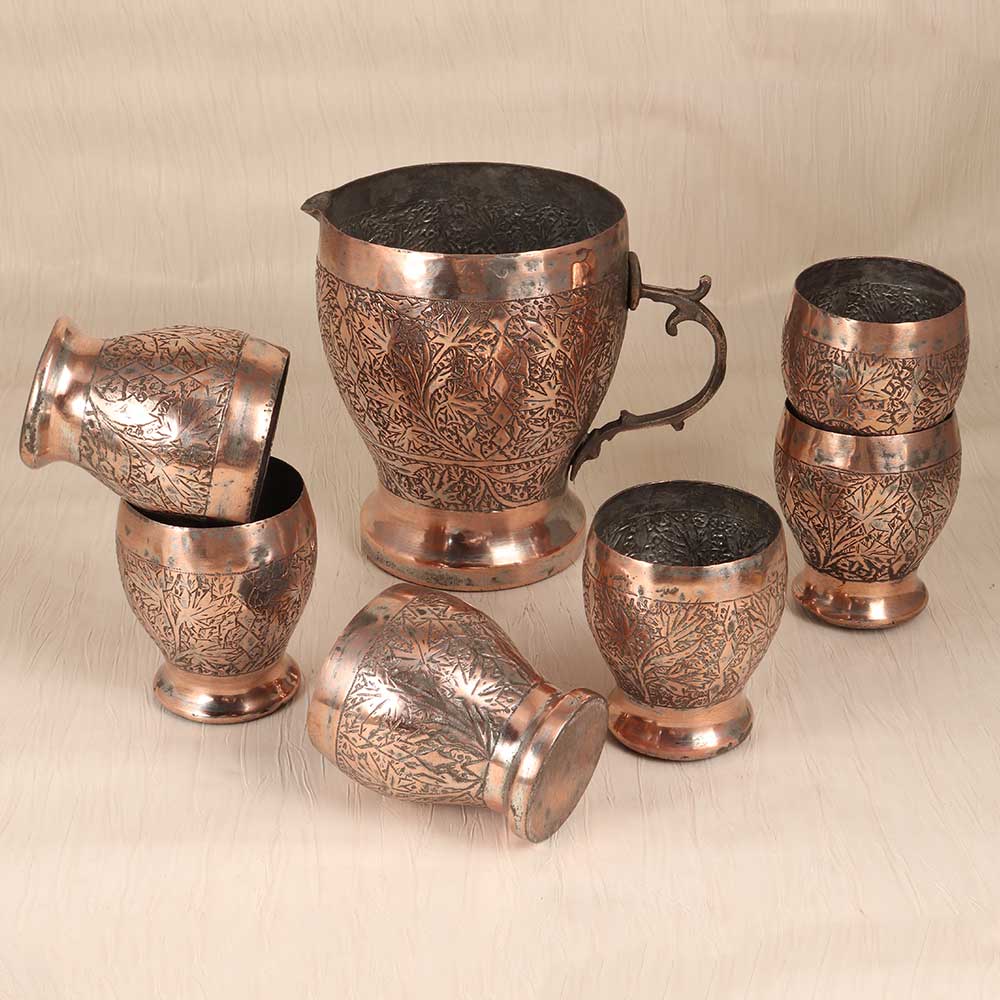 Step back in time with this breathtaking vintage copper Jug with six glass set, handcrafted in the intricate Kashmiri style. Lovingly engraved motifs of flowers, vines and geometric patterns adorn the jug and glasses, exemplifying generations of skilled artistry. This gorgeous set evokes the exoticism of ancient bazaars, where merchants would display prized copperware and glasswork. The jug's etched design reflects remarkable precision and detail. When paired with the six cutwork glasses, the effect is mesmerizing. The translucent glasses allow light to dance across their surface, highlighting the intricate patterns. Whether you use this set for serving drinks or decorative display, it is sure to draw admiration from all who see it. The vintage styling lends a timeless, exotic elegance perfect for collectors of folk art and handcrafted treasures. Bring the rich heritage of Kashmiri artisans into your home with this beautifully engraved jug and glass set today.
