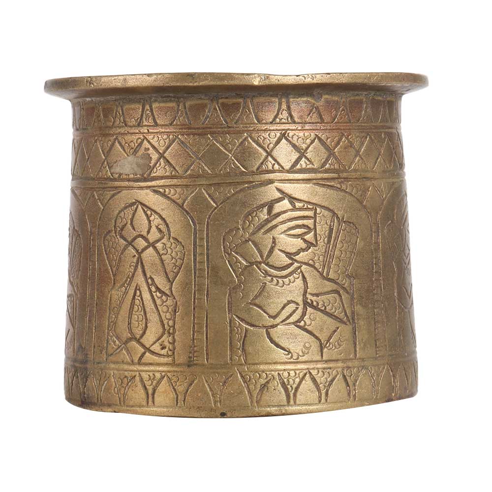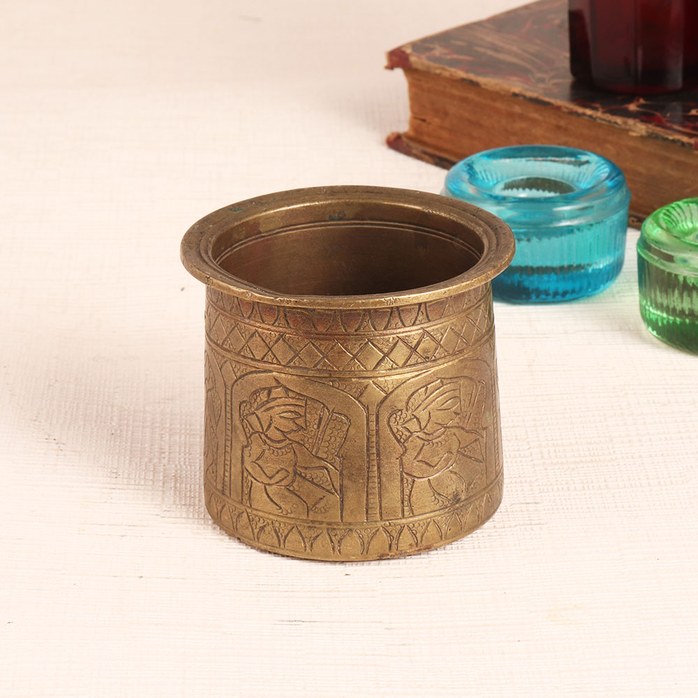 A brass panchpatra which is a beautiful handmade item crafted by skilled artisans from northern India. Made of high-quality brass, this panchpatra is not only sturdy but also has intricate designs that add to its aesthetic appeal. Used for purification of the house with holy water and at temples, this panchpatra is a symbol of the rich cultural heritage of India. Its unique design and beautiful finish make it an excellent item for decoration and vintage collection. This brass panchpatra is a timeless piece that adds sophistication and beauty to any setting while showcasing the artistry of the skilled artisans who created it. It is also a perfect gift for your loved ones on special, festive and auspicious occasion.