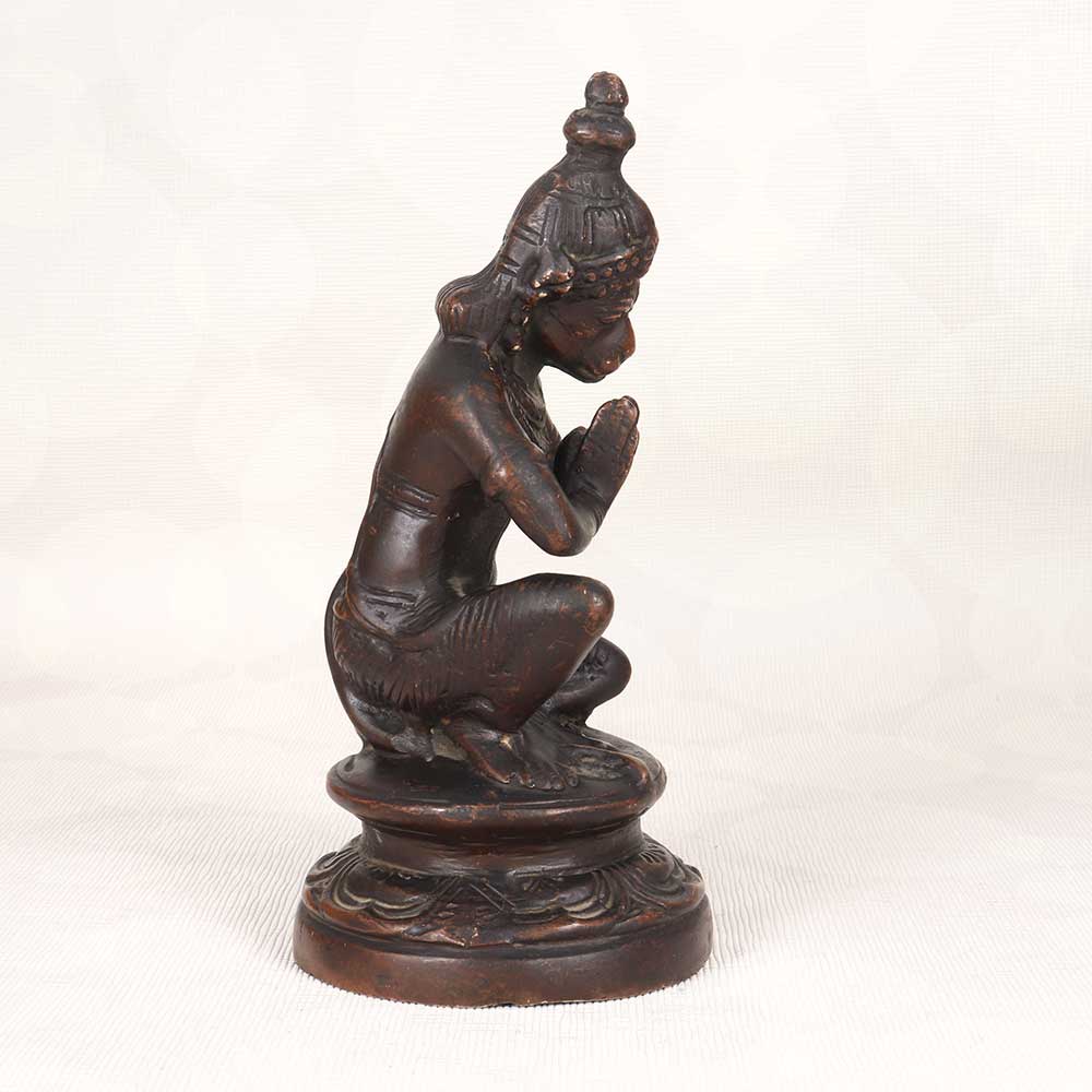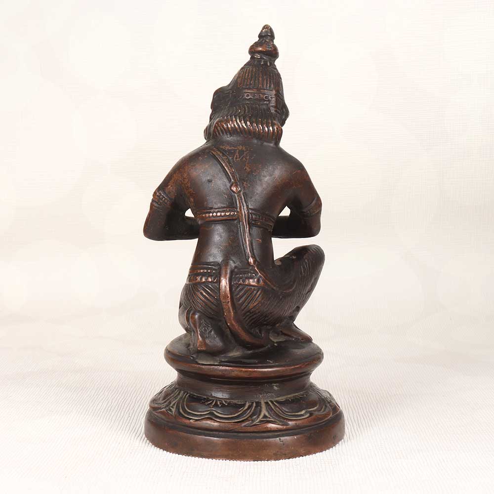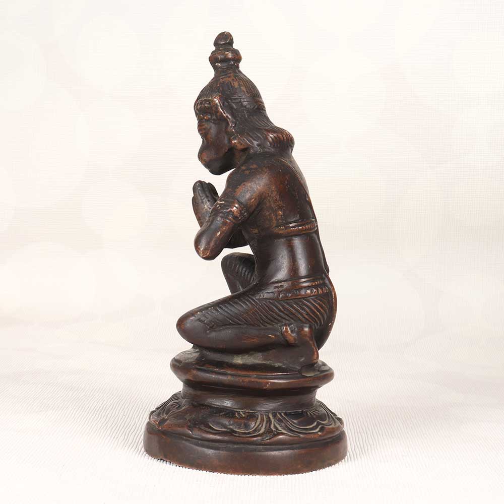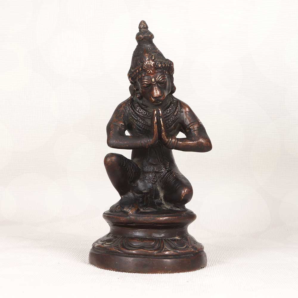 Add divine protection and positivity to your home with this antique-styled brass Hanuman statue. Showcasing superior Indian craftsmanship, it depicts Hanuman seated peacefully with hands clasped in reverent namaskar mudra. Hanuman's graceful form and tranquil aura infuse living spaces with his strength and blessing. Intricate hand-engraved patterns on his crown, jewelry, clothing and facial features make this a true work of devotional art. Hindus believe Hanuman brings protection, success and good fortune when kept in homes or offices. His unwavering devotion and power to overcome obstacles make him one of the most worshipped deities. This special statue captures his serenity and spiritual power. Gift it to Hindu friends or family for housewarmings, birthdays, anniversaries and religious holidays. This vintage-look brass Hanuman murti will be treasured for generations.