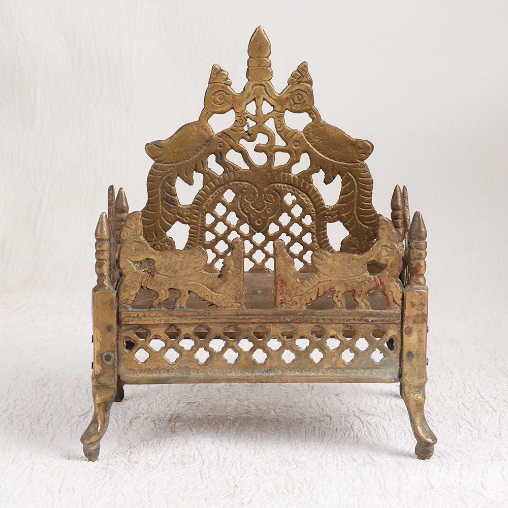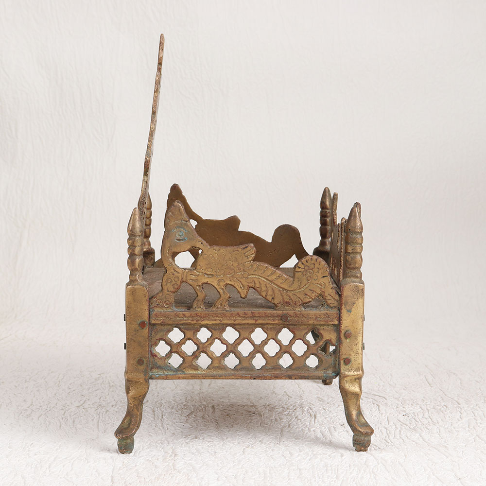 Immerse yourself in the timeless allure of Indian craftsmanship with our exquisite vintage brass Lord Krishna bed, affectionately known as a "Singhasan." This captivating piece showcases a rich antique brown finish, adorned with meticulous peacock carvings, a symbol of divine grace and beauty. Handcrafted with unwavering precision by highly talented Indian artisans, this piece is a testament to their artistry and dedication. Crafted from high-quality copper, this Singhasan is not merely a piece of furniture, it's a work of art that captures the essence of Indian spirituality. Its versatile design allows it to grace your home, office, restaurant, hotel, cafe, or shop prayer room, adding an air of reverence and serenity. Perfect for those with a penchant for vintage aesthetics, this Singhasan can effortlessly become a treasured addition to your antique collection. Additionally, it makes for a thoughtful gift, ideal for presenting to your family, friends or relatives during special, festive, or auspicious occasions. Let this exquisite brass Lord Krishna bed be a symbol of art, faith, and tradition in your life.