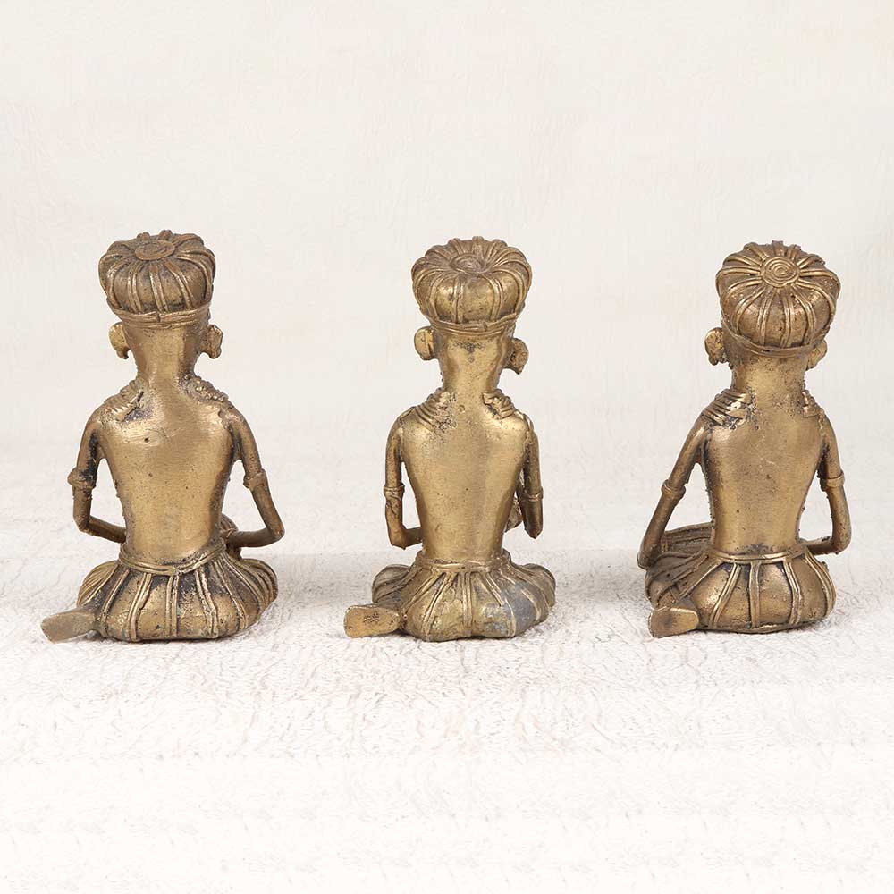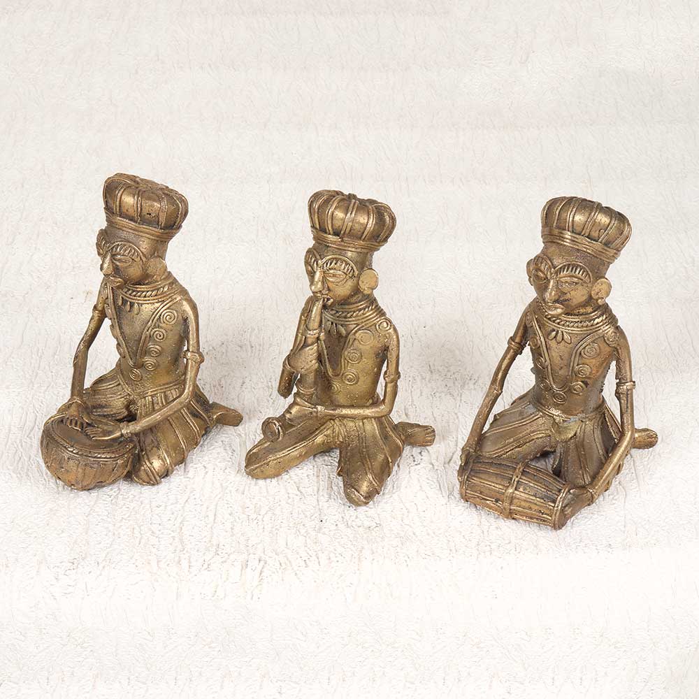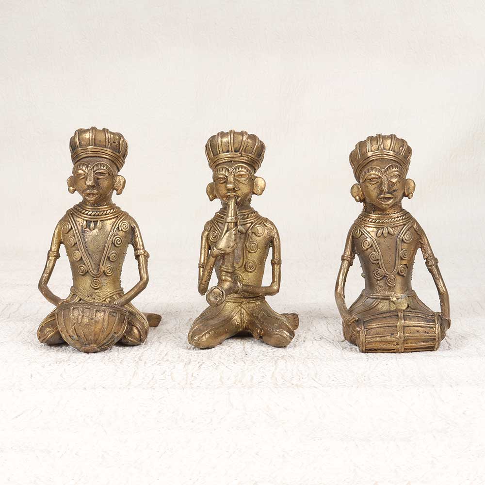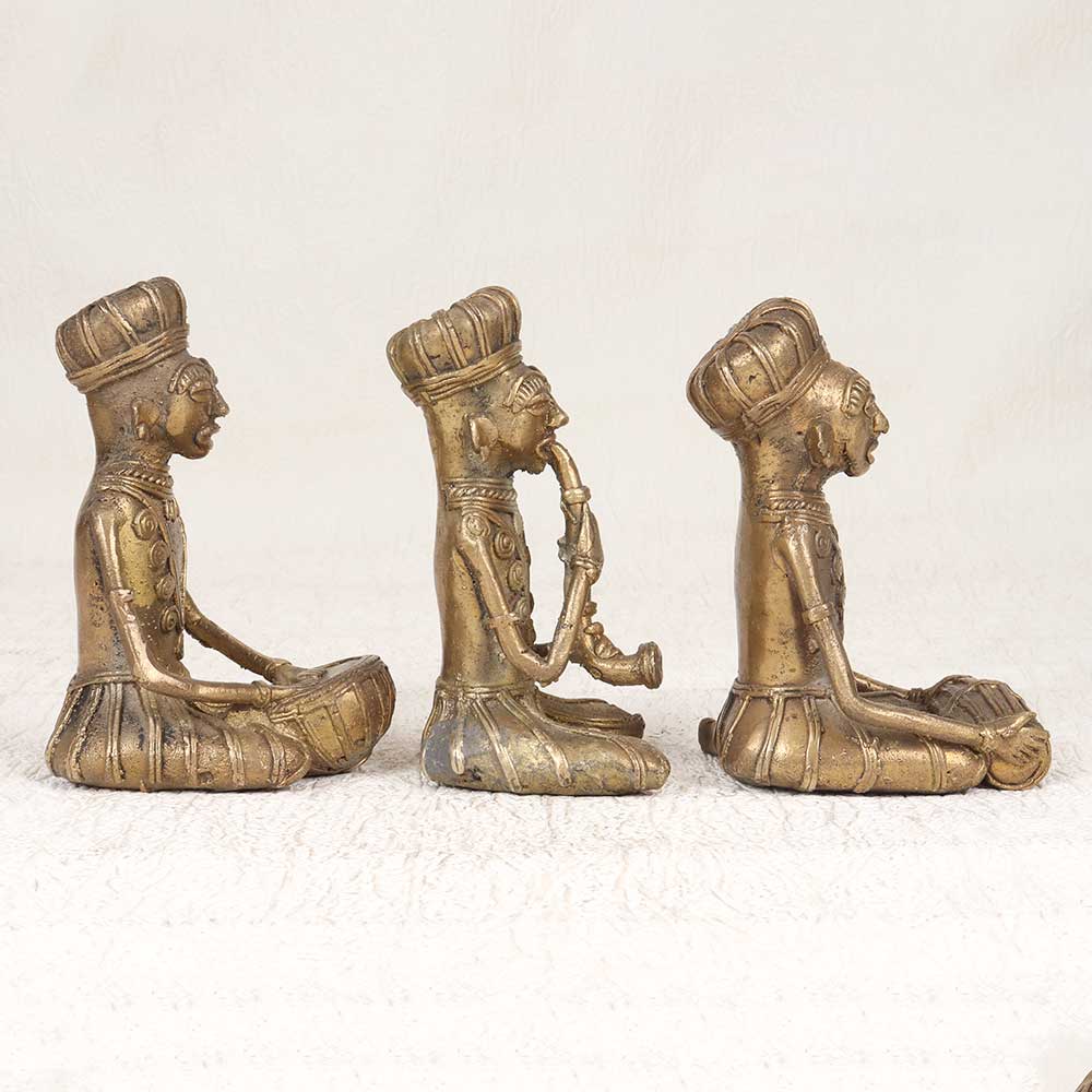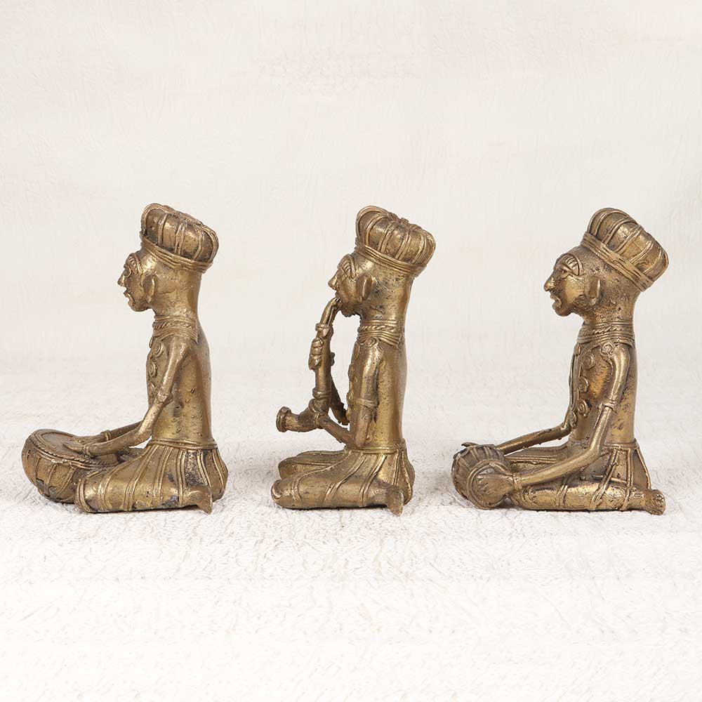 Make a show-stopping statement in your home with this set of 3 vintage Bengali brass musician statues. Exquisitely crafted, each statue depicts a different classical instrument - violin, trumpet and saxophone - frozen in artistic motion as if captured mid-performance. Perfect for classical music enthusiasts, these statues are an elegant way to infuse your space with art and sophistication. Arrange the set together to create a mesmerizing tableau, or place individually as cherished accents. The intricate craftsmanship is sure to spark intrigue and conversation among guests. For those who want to surround themselves with objects as artful as the music they love, these Bengali musician statues make a striking statement.