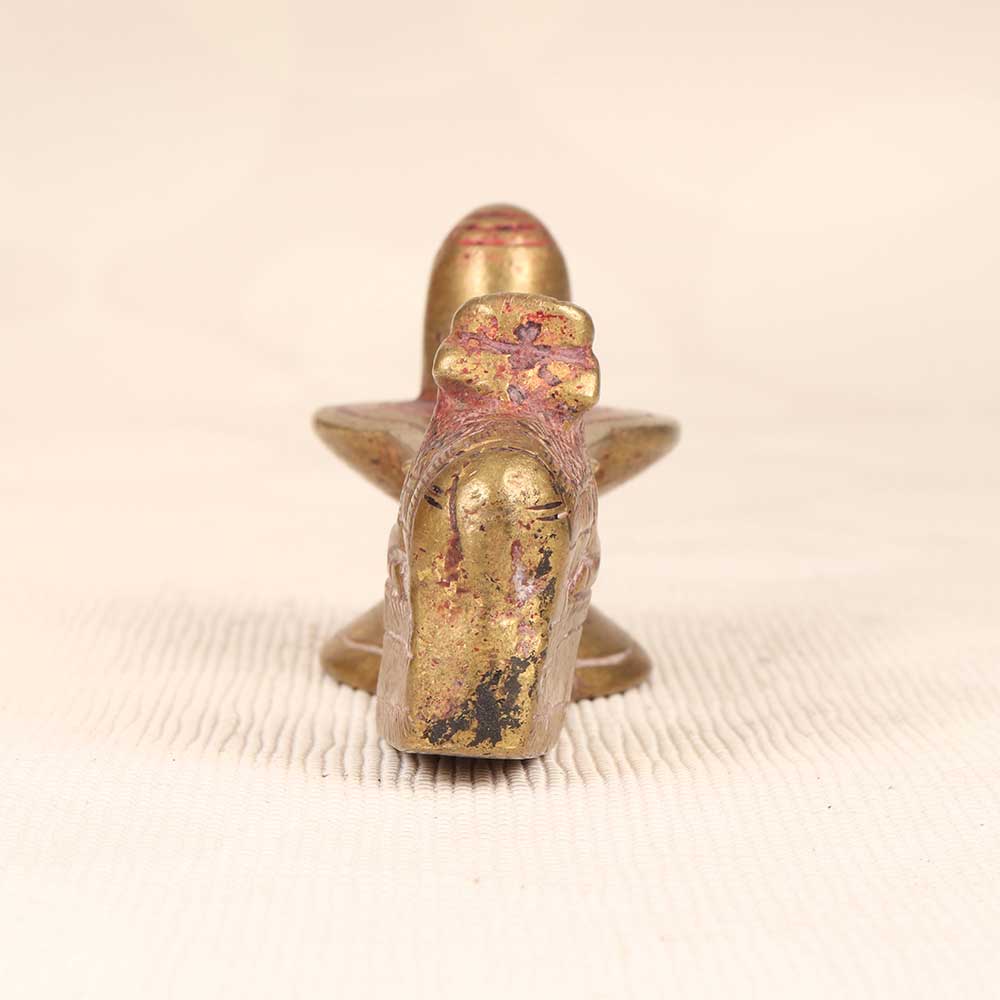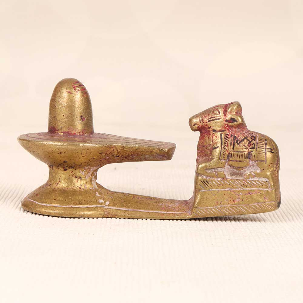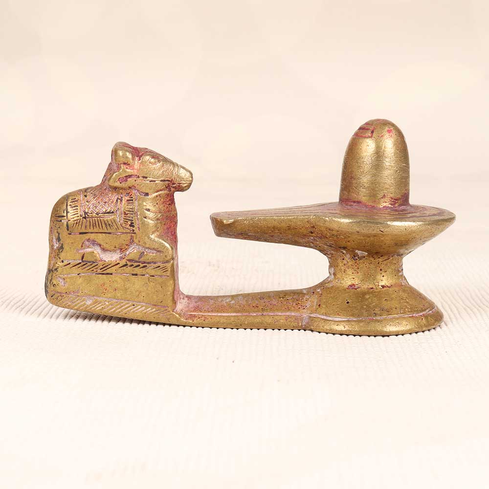 This exquisite vintage brass Nandi and Shivling statue epitomizes the deep devotion and spiritual connection between Lord Shiva and his vahana Nandi. Cast in the traditional Himalayan art style, this statue features the mighty yet peaceful Nandi bowing before the sacred Shivling. Nandi, the bull mount of Lord Shiva, represents strength, dedication, and wisdom. Placing this in your home surrounds you with tranquility and focus, reminding you to follow your dharma. The Shivling represents Lord Shiva's infinite and formless nature as the destroyer and regenerator of the universe. Bring a spiritual aura into your home with this special vintage statue. Its aged brass patina and Himalayan styling provide serene elegance to any decor. Make your home a sacred space with this meaningful symbol of devotion and spiritual connection.