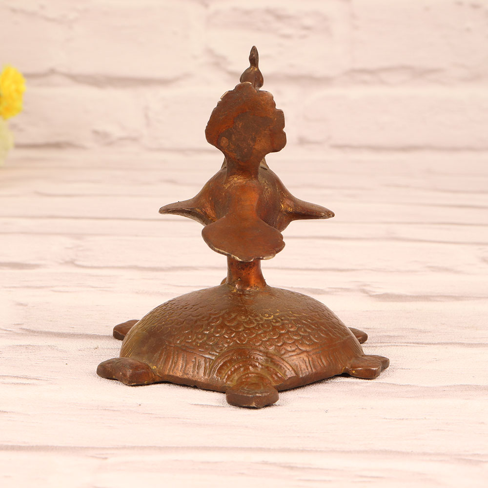 Adorn your home with the exquisite charm of our Brass Peacock Incense Holder on Turtle in Brass Finish. Meticulously handcrafted by talented Indian artisans, this captivating piece seamlessly blends tradition and sophistication. Crafted from high-quality brass, its intricate details showcase the artisan’s mastery, while the antique brown finish adds a touch of timeless elegance. The majestic peacock perched on a turtle creates a unique and harmonious design, making it a perfect addition to any home, office, restaurant, hotel, or cafe. Beyond its decorative allure, this incense holder serves a practical purpose, infusing your surroundings with the soothing fragrance of your favourite incense. Celebrate special moments by gifting this symbol of artistry and cultural richness to your family, friends or relatives on occasions that are festive, auspicious, or simply special. Embrace the fusion of craftsmanship and beauty with this handmade brass incense holder, a testament to India's rich artistic heritage.
