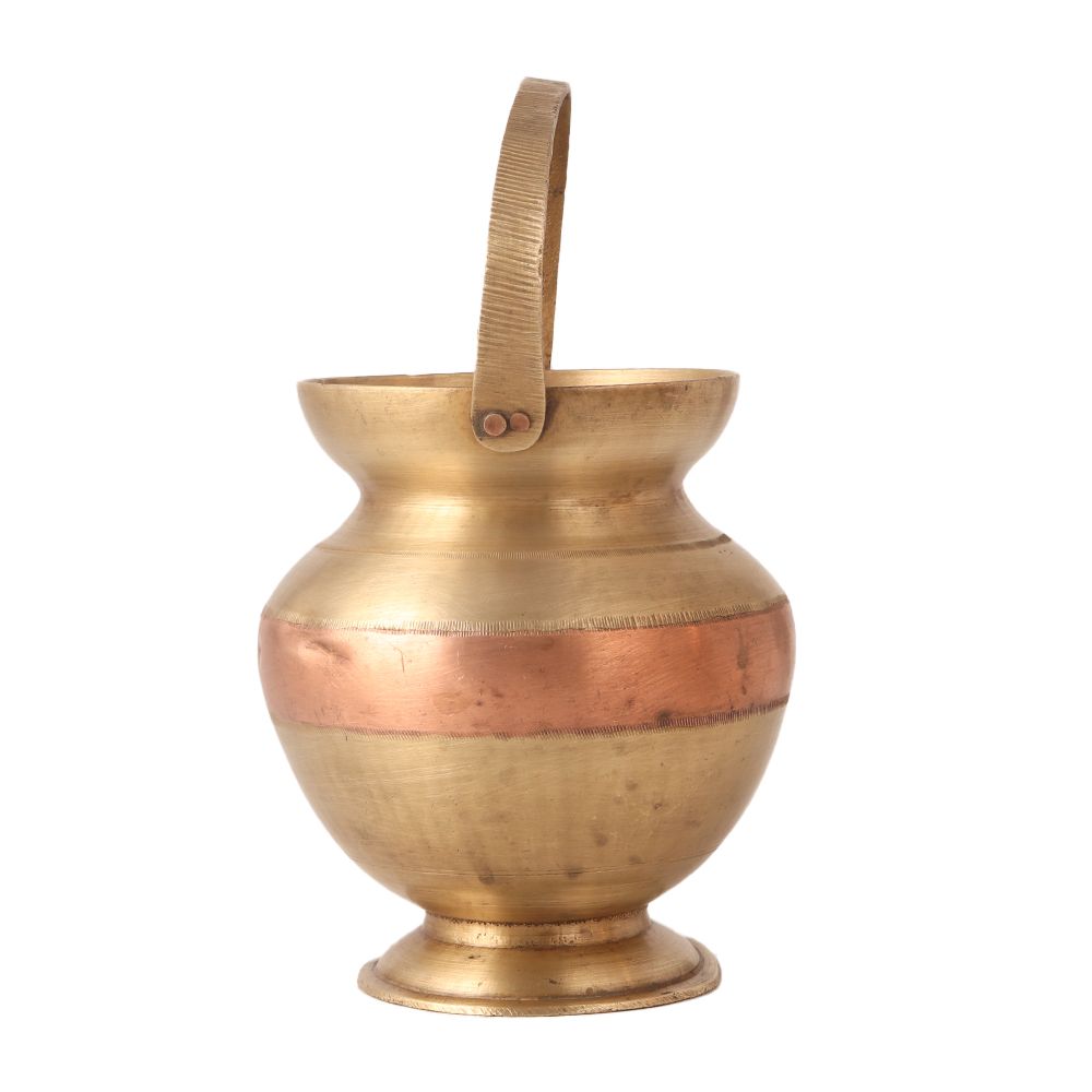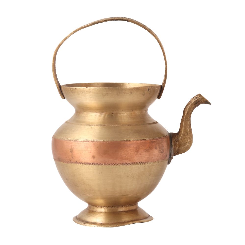 Buy a handcrafted brass kamandalu or water pot for sale online on our website. Kamandal or Kamandalam is an oblong shaped water pot used by saints to store holy water and distribute it after Pooja. In Hinduism, the water in the kamandal represents amrit, the elixir of life. It is made of high quality brass and covered with copper in the center, which is why it is also known as the Ganga Jamuna water pot. Place this incredible piece in a museum, exhibition or in your vintage art collection. This water pot will add an ethnic touch to the interior of your home, office or hotel. A promising gift for housewarming, anniversary, wedding, birthday or auspicious function to your near and dear one.