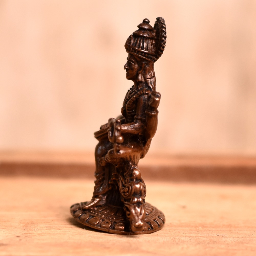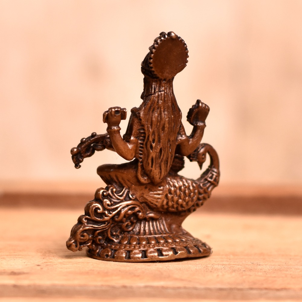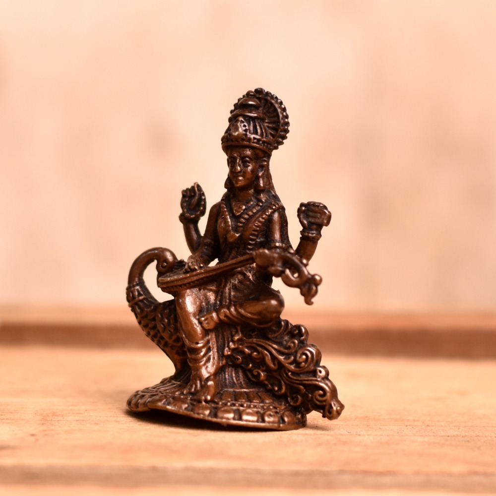 A stunning handmade copper statue of Goddess Saraswati that is a masterpiece of skilled Indian artisans, and is the perfect addition to any prayer room, temple, or home. The intricate details of the statue make it a unique and valuable piece of art, with the goddess seated on her vahana swan and playing her musical instrument, the veena. Copper is considered to be an auspicious metal in India, making this goddess Saraswati murti even more special. Worshipped in many Indian temples, the statue can also be placed in a home temple, office, restaurant, hotel, cafe, or shop. Its beauty and elegance will surely inspire and add a sense of divine presence to any space. This god statue is not only a beautiful piece of art, but it is also a meaningful and thoughtful gift for loved ones on special or festive occasions. With the convenience of buying a Goddess Saraswati idol online, you can easily purchase this statue and enjoy the blessings of the goddess in your home or workspace.