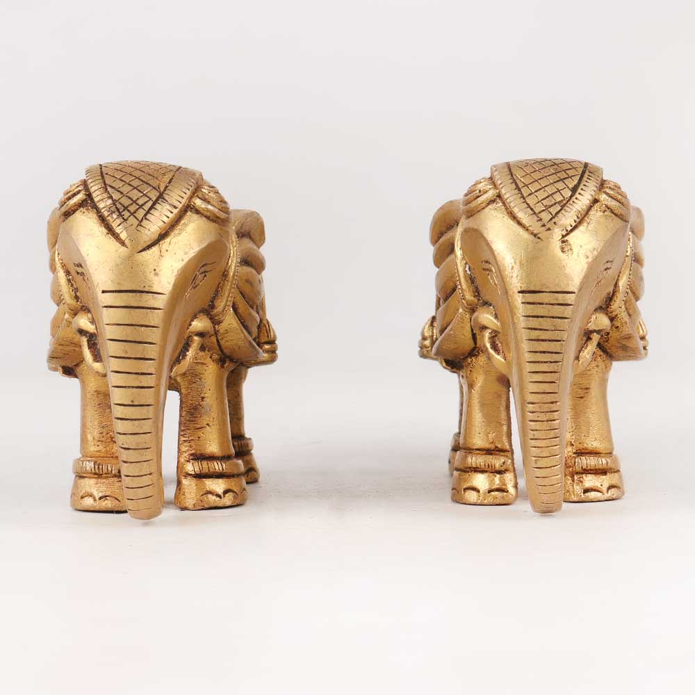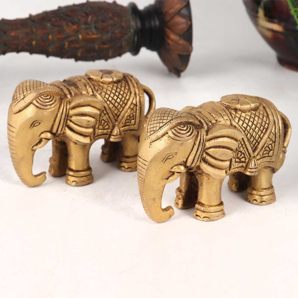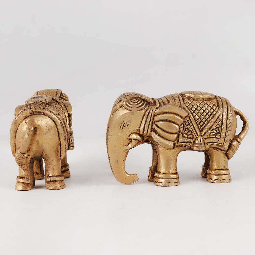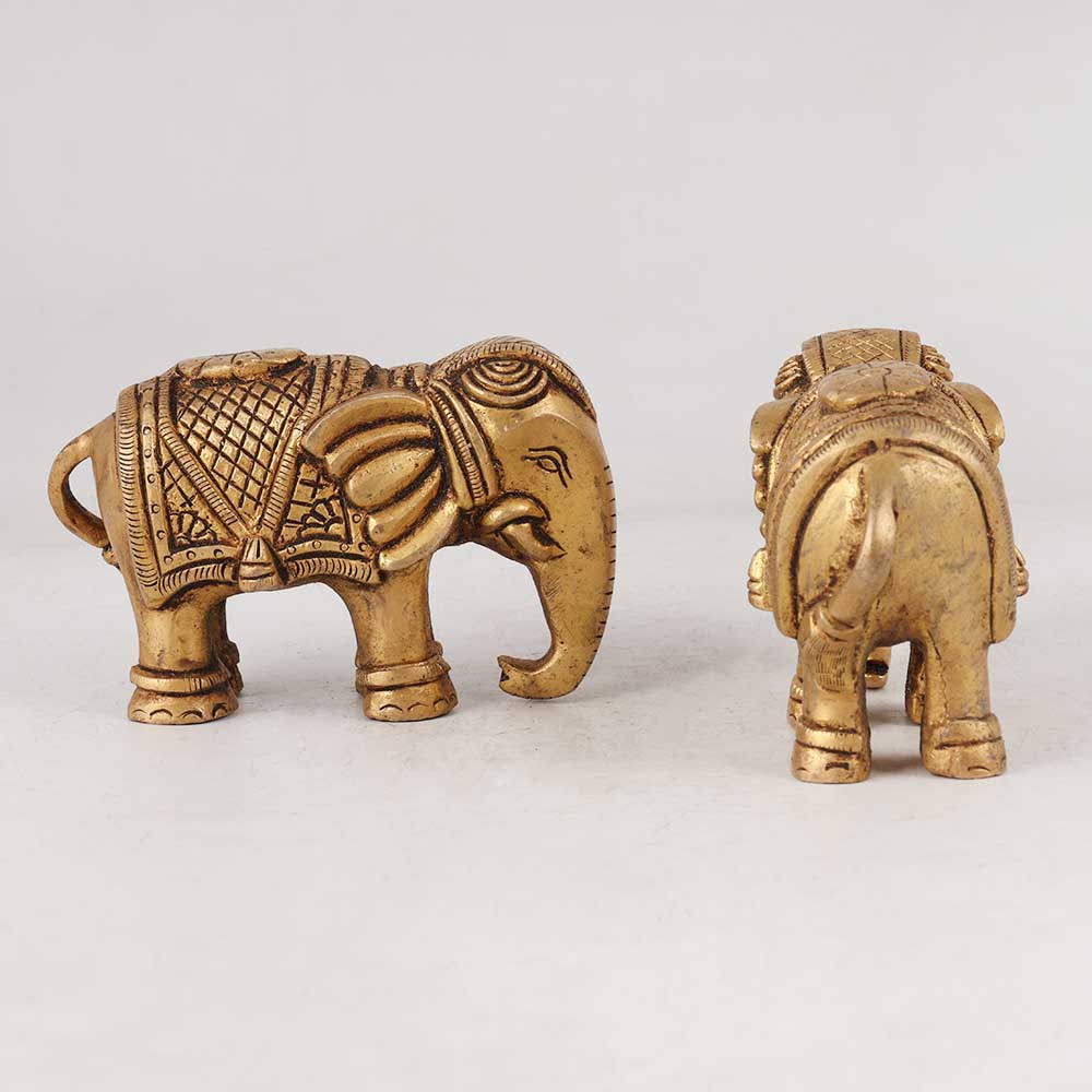 A captivating pair of brass elephant statues that is skillfully handcrafted by talented Indian craftsmen. These magnificent sculptures boast intricate detailing, delicately etched into their antique golden finish, exuding a timeless charm that effortlessly blends with any setting. Standing as a symbol of wisdom, strength, and prosperity, these statues will add an aura of elegance and cultural richness to any space. Perfect for adorning homes, offices, restaurants, hotels, or cafes, these stunning elephants serve as exceptional decorative pieces. Their captivating presence can instantly transform any ambiance into an opulent and inviting atmosphere. Whether displayed in exhibitions or cherished as a part of a vintage collection, these statues are sure to be conversation starters. Not just for personal enjoyment, these brass elephants make thoughtful and cherished gifts for loved ones during special occasions or festive celebrations. Embrace the allure of Indian craftsmanship and tradition with these remarkable elephant statues, and bask in the admiration they garner from all who lay eyes upon them.
