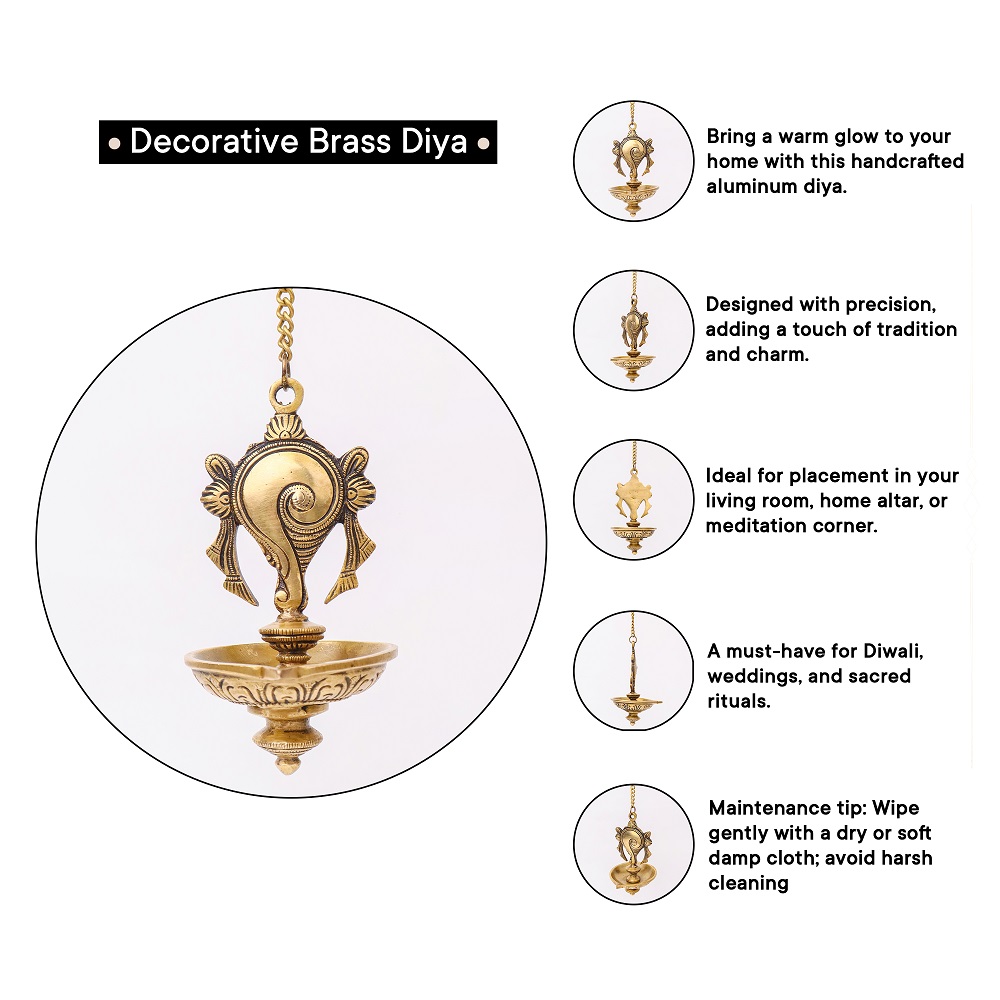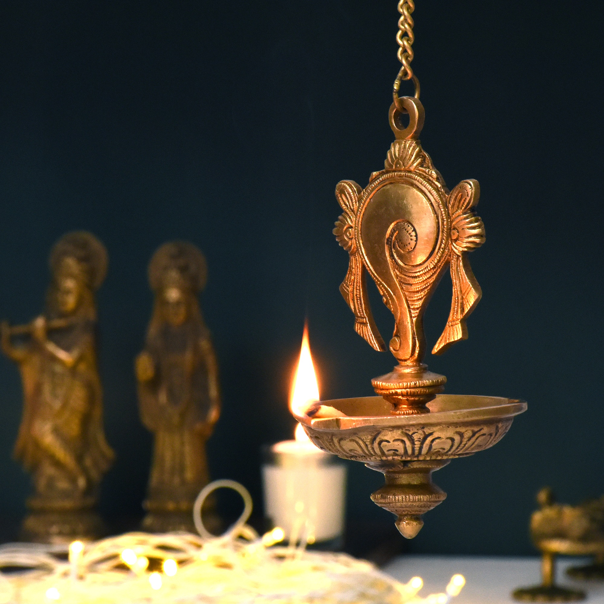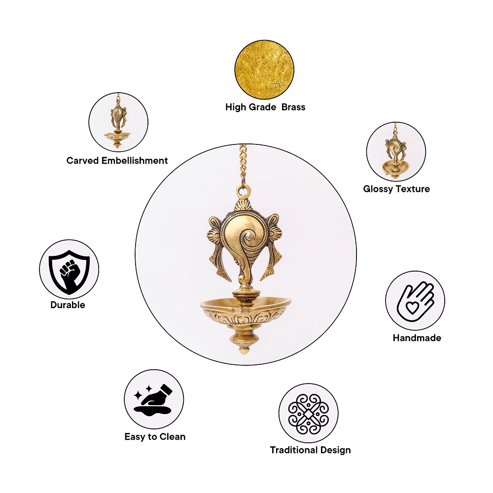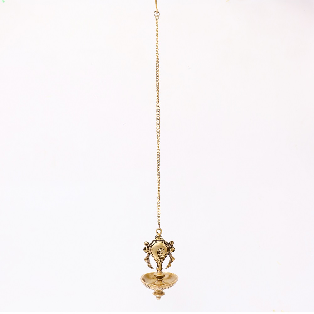 This artistic handmade golden brass hanging diya with a chain can be used to decorate the living room, pooja room, foyer, altar, meditation room, entrance to your home and office during Diwali or other festivals.