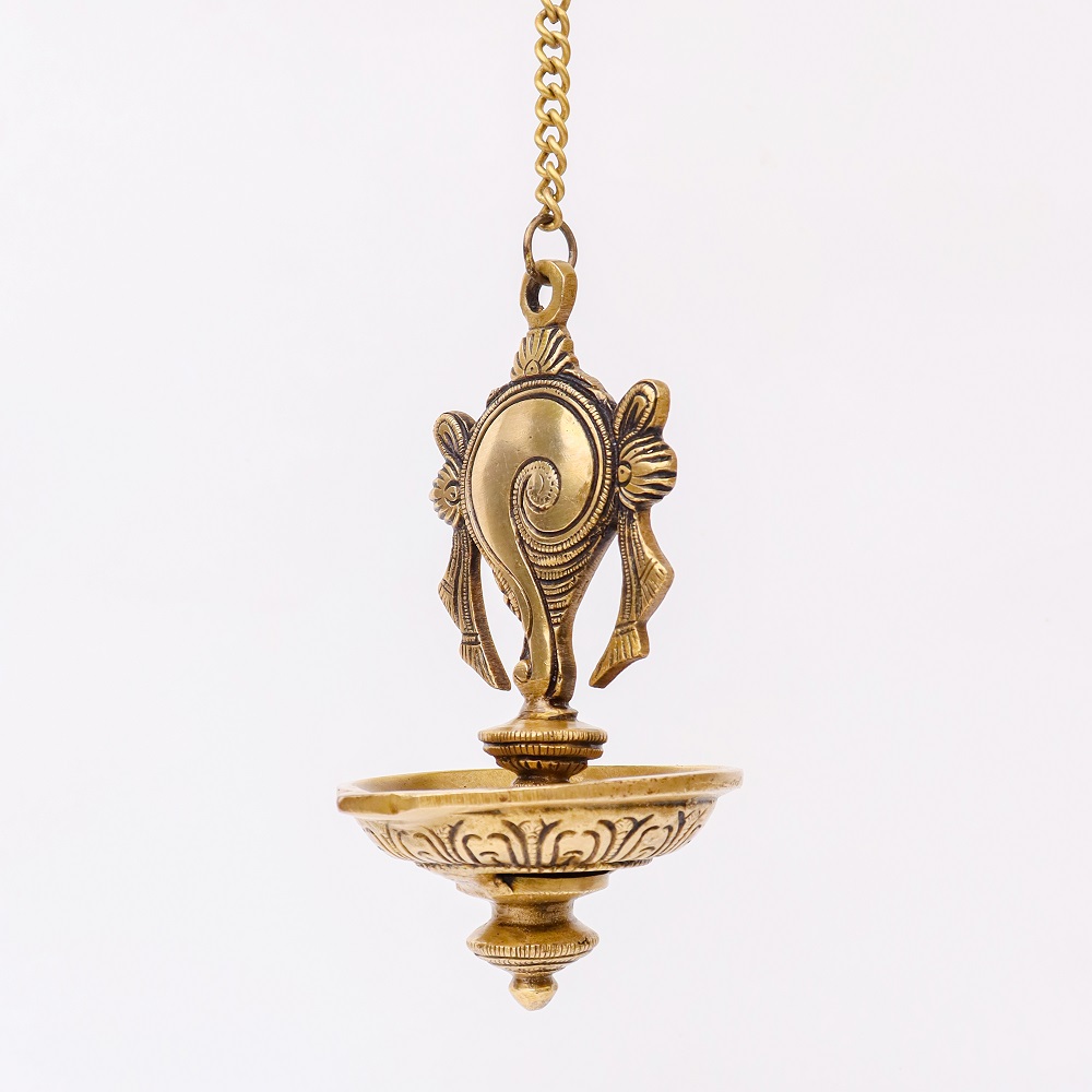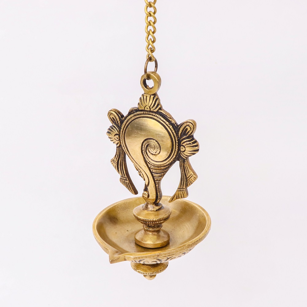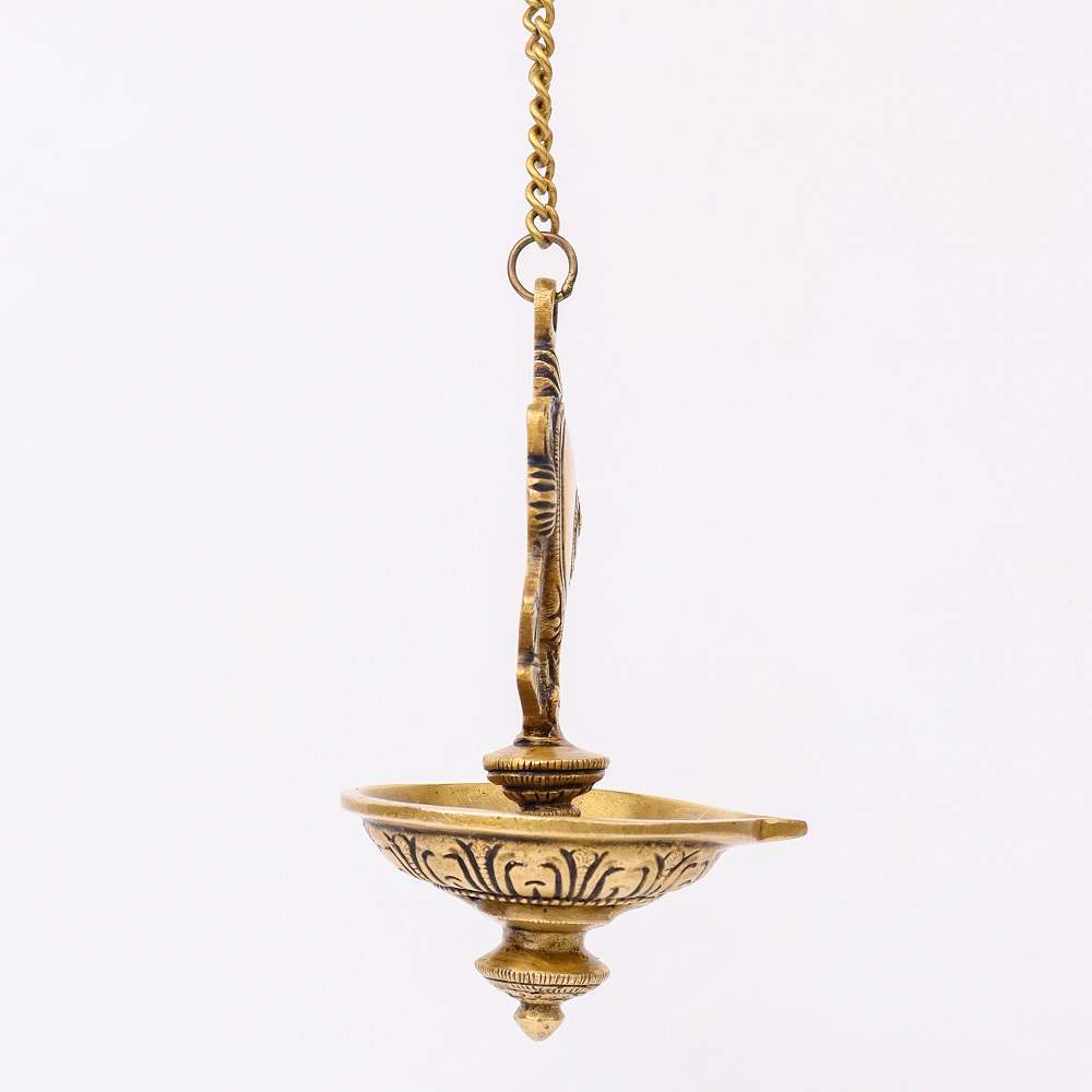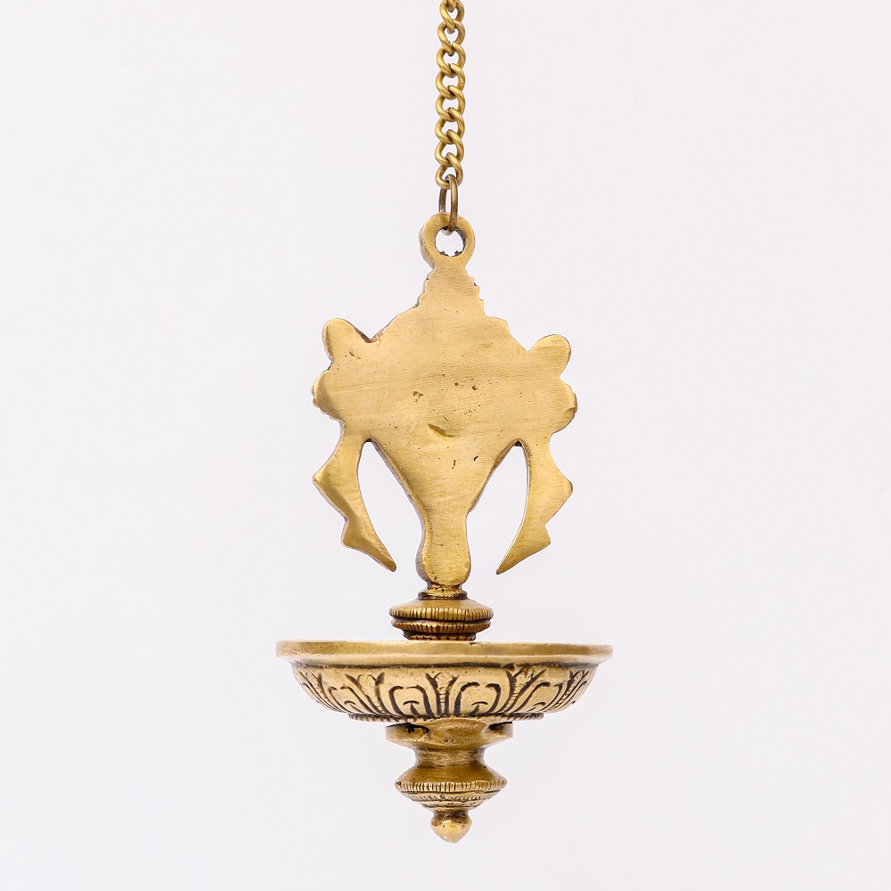 This artistic handmade golden brass hanging diya with a chain can be used to decorate the living room, pooja room, foyer, altar, meditation room, entrance to your home and office during Diwali or other festivals.