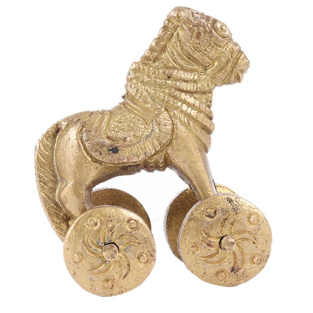 Toy horse statue from a solid brass hindu temple in southern India is an exceptional rare collectable toy . The horse is supported by four wheels and is equipped with a lovely bridle. The horse and wheels is in excellent antique condition that helps the toy run smoothly on the wheels.