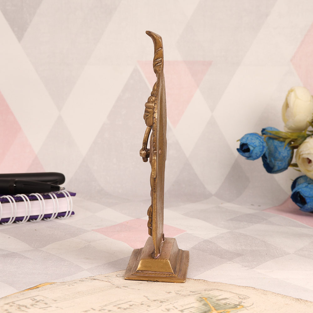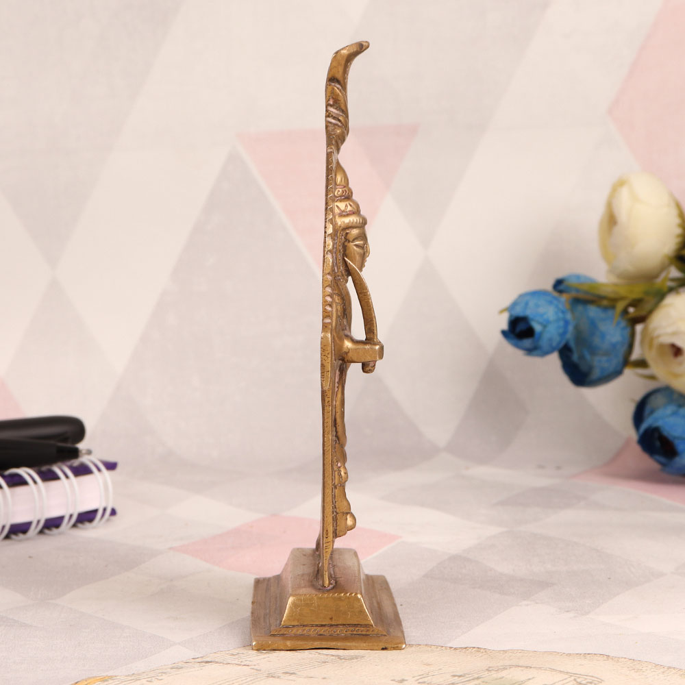 This Lord Virabhadra Brass Plate is a symbol of divine power and strength. Crafted by highly skilled Indian artisans with meticulous attention to detail, this exquisite masterpiece showcases Lord Virabhadra in all his glory, standing resolute upon a platform, bathed in an antique golden finish. Lord Virabhadra is a revered deity in Hindu mythology, born from the wrath of Lord Shiva to avenge the death of his beloved wife, Sati. His fierce and awe-inspiring form is beautifully captured in this brass plate, radiating a sense of divine protection and energy. Handmade with the utmost precision, this brass plate is a testament to the rich heritage of Indian craftsmanship. Its high-quality brass construction ensures longevity, making it a timeless addition to your sacred prayer room or a captivating decorative piece for your home, office, restaurant, hotel, cafe, or shop. Furthermore, the Lord Virabhadra Brass Plate makes for an unforgettable gift for your family, friends or relatives on special, festive, or auspicious occasions, bestowing upon them the blessings and protection of Lord Virabhadra himself. Embrace the divine with this masterpiece, a harmonious blend of spirituality and artistry, crafted for those who appreciate both.